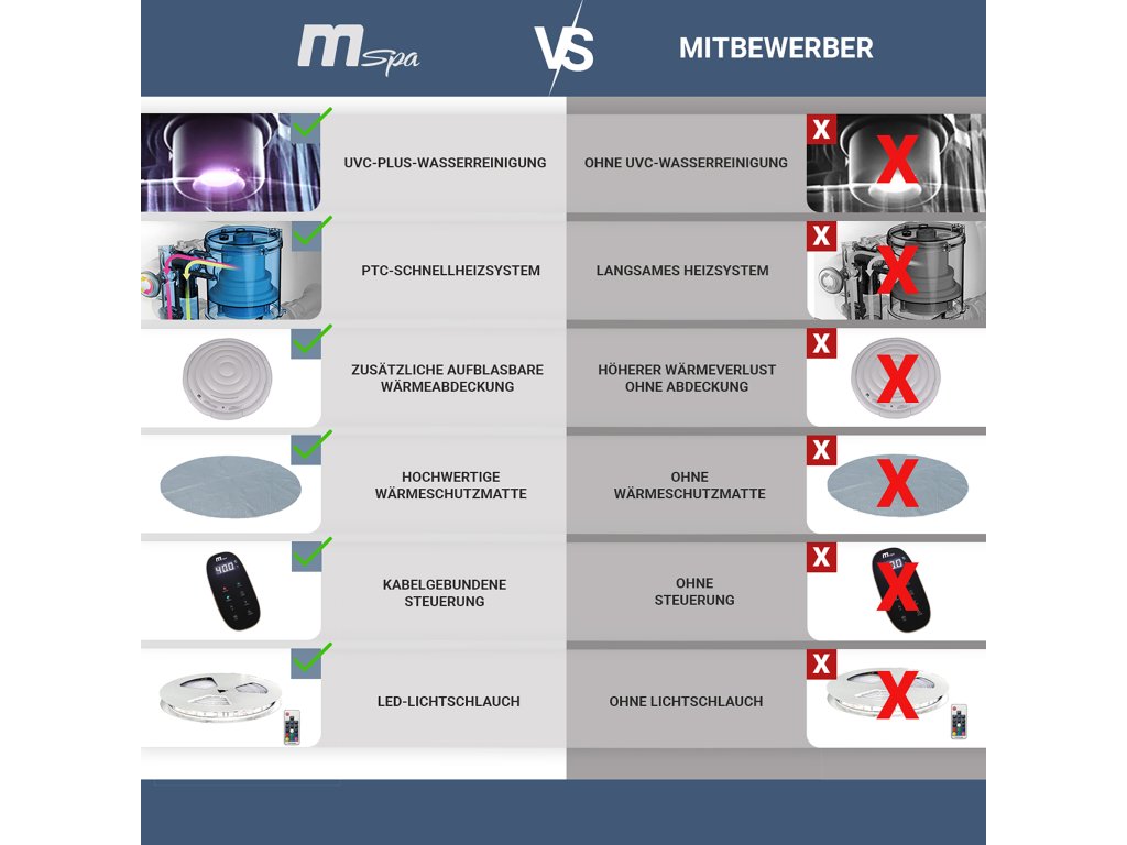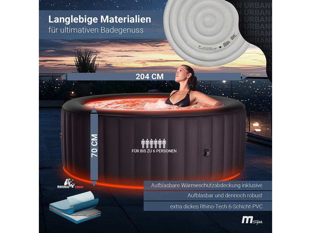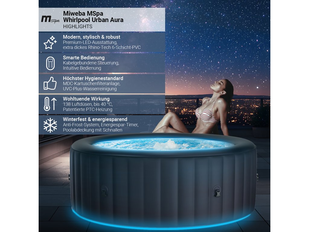 Vírivka je nafukovacia . Na jej nafúknutie stačí stlačiť dve tlačidlá. Všetko ostatné sa deje automaticky. Vďaka 360° systému bublín a trom úrovniam intenzity zaručuje vírivka maximálnu zábavu z kúpania až pre šesť osôb – a to nielen v teplých letných mesiacoch. Vďaka systému rýchleho ohrevu PTC môžete vodu rýchlo ohriať, a to aj v chladných dňoch. Technológia UVC-Plus spolu s antibakteriálnou vnútornou výstelkou zaisťuje najvyššiu úroveň hygieny. Doprajte si viac zábavy v živote: s vírivkou Miweba MSpa Aurora je to veľmi jednoduché.