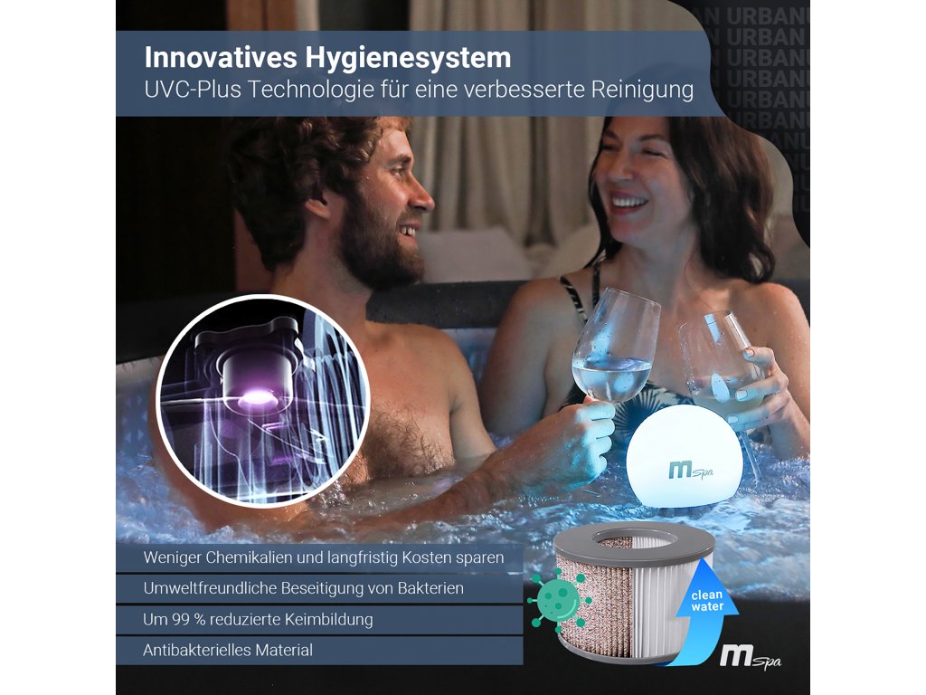 Vďaka ešte výkonnejšiemu UVC+ svetlu je vírivka MSpa Aurora vybavená inteligentným hygienickým systémom, ktorý využíva najnovšie technológie. Systém UVC+ eliminuje množstvo baktérií vo vode pretekajúcej filtrom. Navyše je šetrný k životnému prostrediu, znižuje potrebu chemikálií a z dlhodobého hľadiska šetrí peniaze. Takže si môžete užívať svoju domácu vírivku každý deň bez obáv.