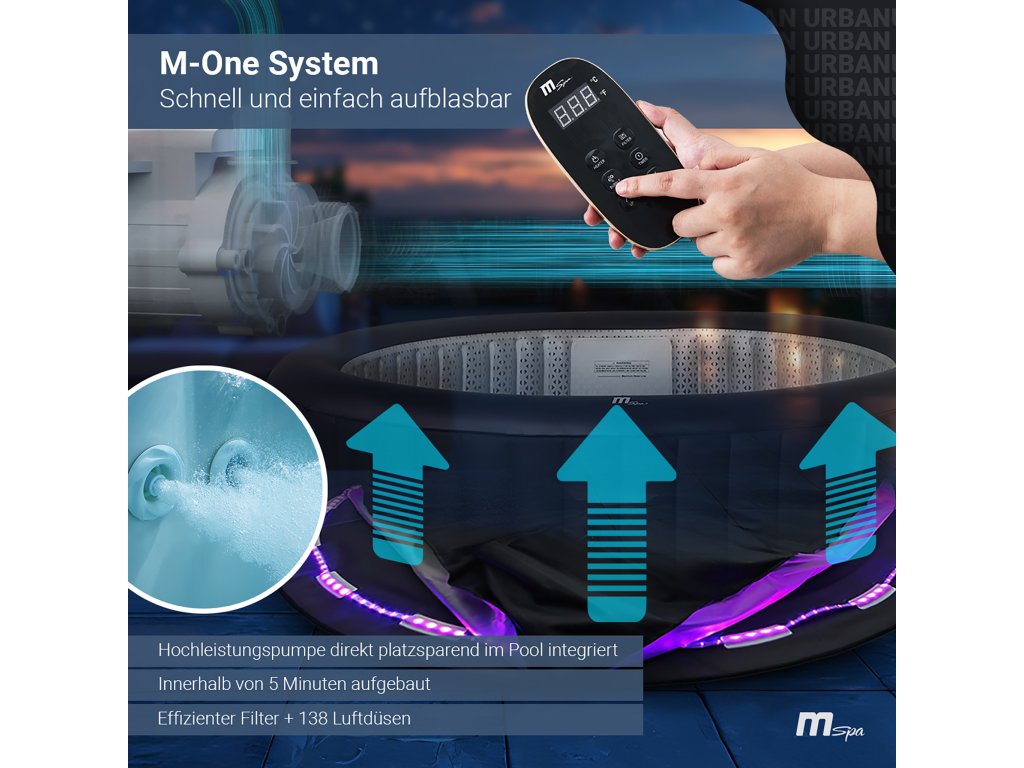 Vírivka Miweba MSpa Aurora sa vyznačuje maximálnym pohodlím pri nastavovaní. Vďaka systému M-ONE je vírivka nielen nafukovacia, ale aj extrémne rýchla. Celý proces je dokončený za päť minút. Stačí pripojiť zdroj napájania a potom súčasne stlačiť tlačidlá „BUBBLE“ a „UP“. Počas nafukovania integrovaný manometer monitoruje tlak vzduchu a zastaví prúdenie vzduchu hneď, ako sa dosiahne optimálna úroveň tlaku, a zábava sa môže začať.