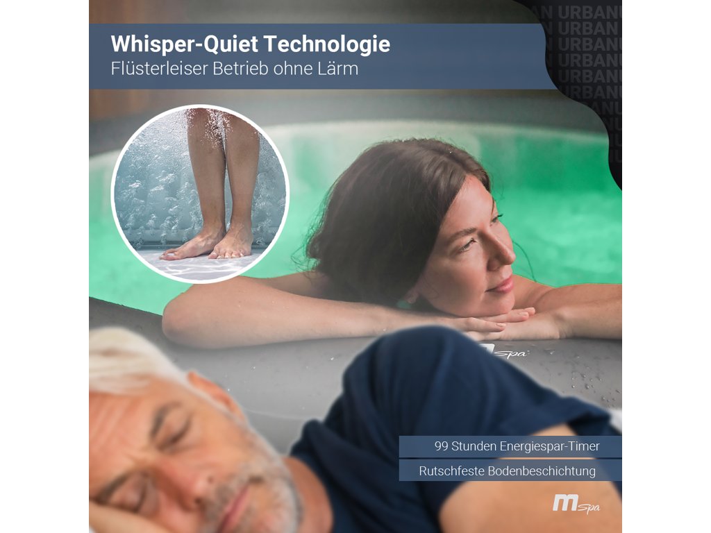 Aurora od Miweba nie je len nafukovacia vírivka. Je tiež mimoriadne tichá . Vykurovací systém je prakticky tichý. A funkcia vírivky produkuje hladinu hluku okolo 70 dB, čo zhruba zodpovedá zvuku tečúcej batérie. Lepšie to už ani nemôže byť. Vďaka technológii Advance Whisper Quiet patria vírivky MSpa medzi najtichšie vo svojej triede. Aurora tak vytvára ideálne podmienky pre relaxačný kúpeľ vo vlastnom bazéne, čo je ďalší dobrý dôvod, prečo by ste si mali kúpiť túto vírivku.