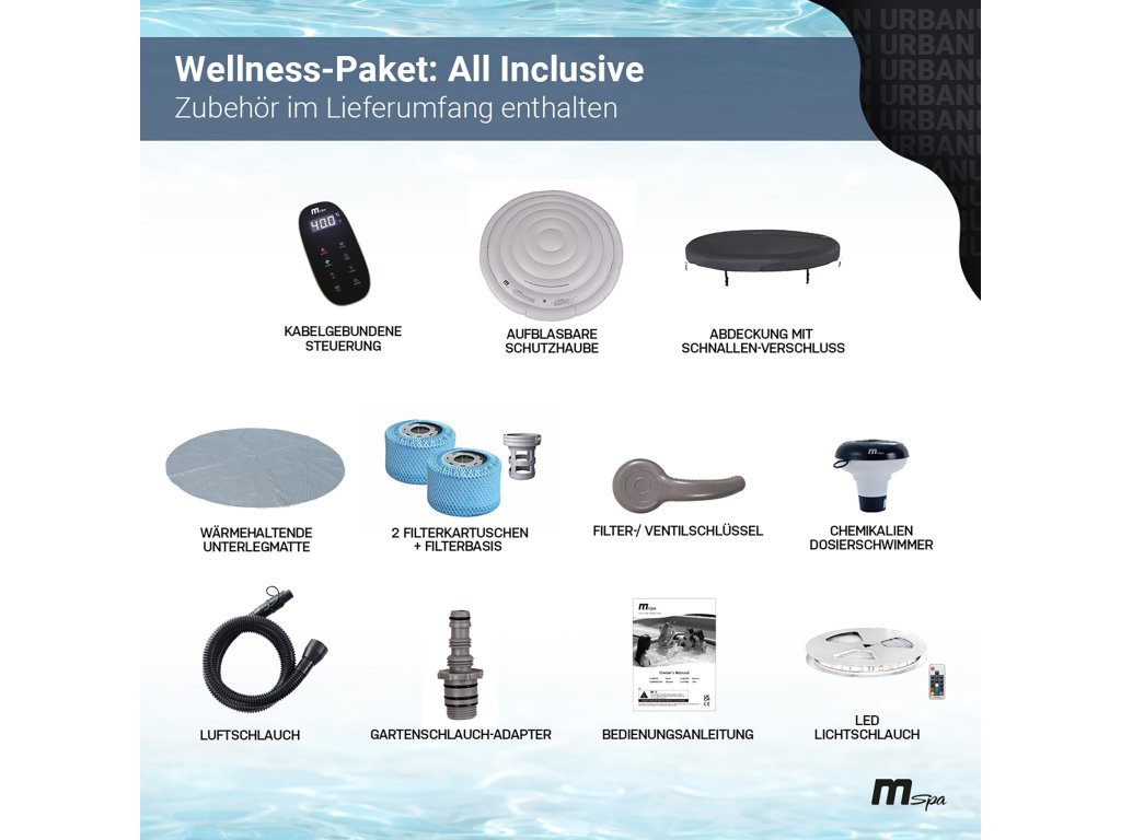 Balenie obsahuje: vírivku, kryt bazéna s upevňovacími prackami, plavák na dávkovanie chemikálií, RGB LED ambientné osvetlenie s diaľkovým ovládaním, 2x filtračné patróny, plniaca hadica s manometrom, adaptér na záhradnú hadicu