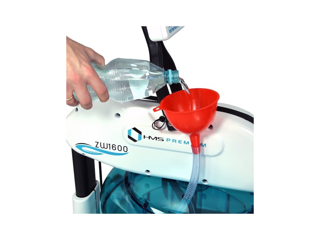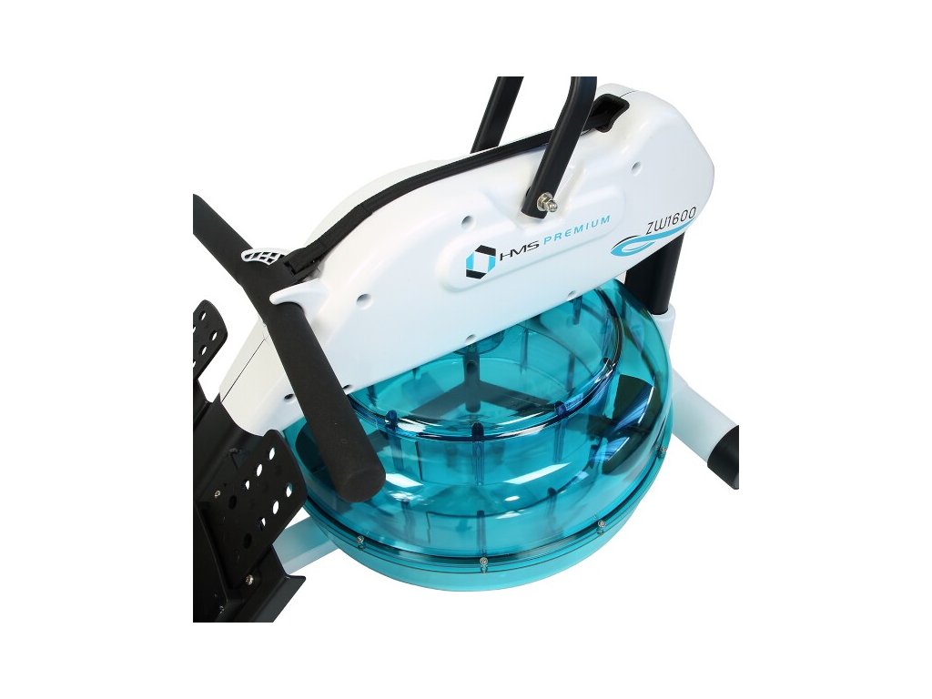 Vodný "veslár" ZW1600 je vybavený nádržou pre napúšťanie (ideálne destilovanou) vodou. Výška jej hladiny nám určuje odpor počas cvičenia. Lopatky v nádrži sú pod ideálnym uhlom pre maximálnu plynulosť pohybu. Mechanický zvuk odporového kolesa u klasických modelov je u nášho stroja ZW1600 nahradený príjemným šumením vody. Pre úpravu výšky hladiny je súčasťou balenia lievik s hadicou a pumpička.