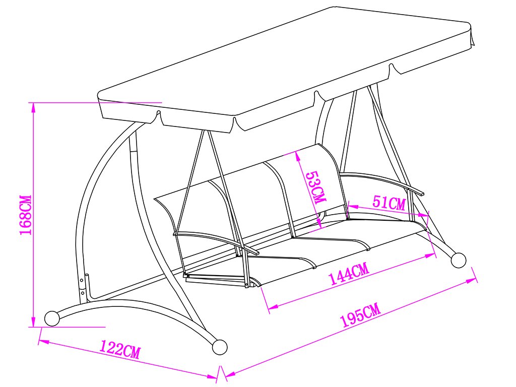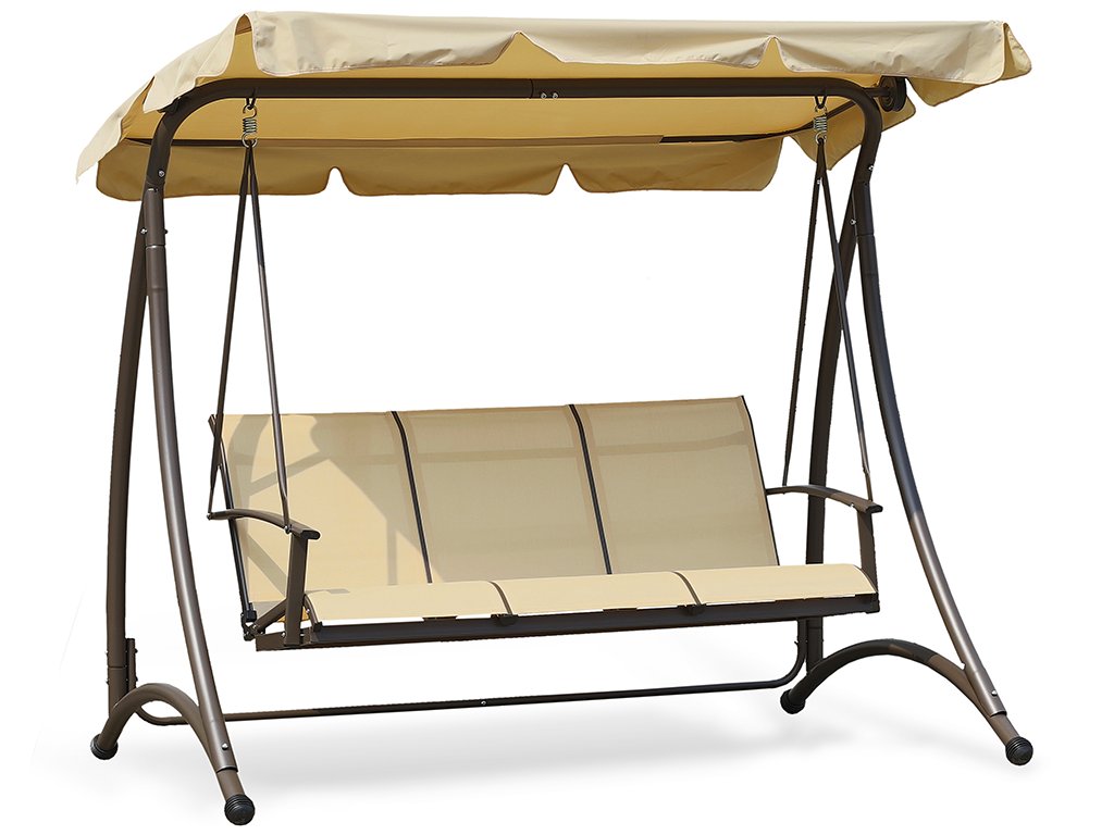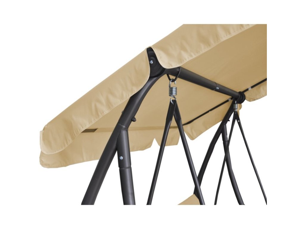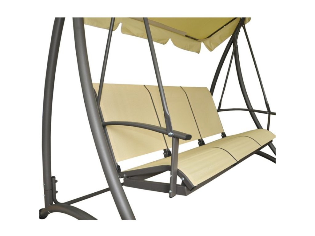 Záhradná hojdačka Duvlan Loretta vhodná pre tri osoby s nosnosťou 300 kg. Pevný oceľový rám a pogumované nožičky. Vodovzdorný materiál.
