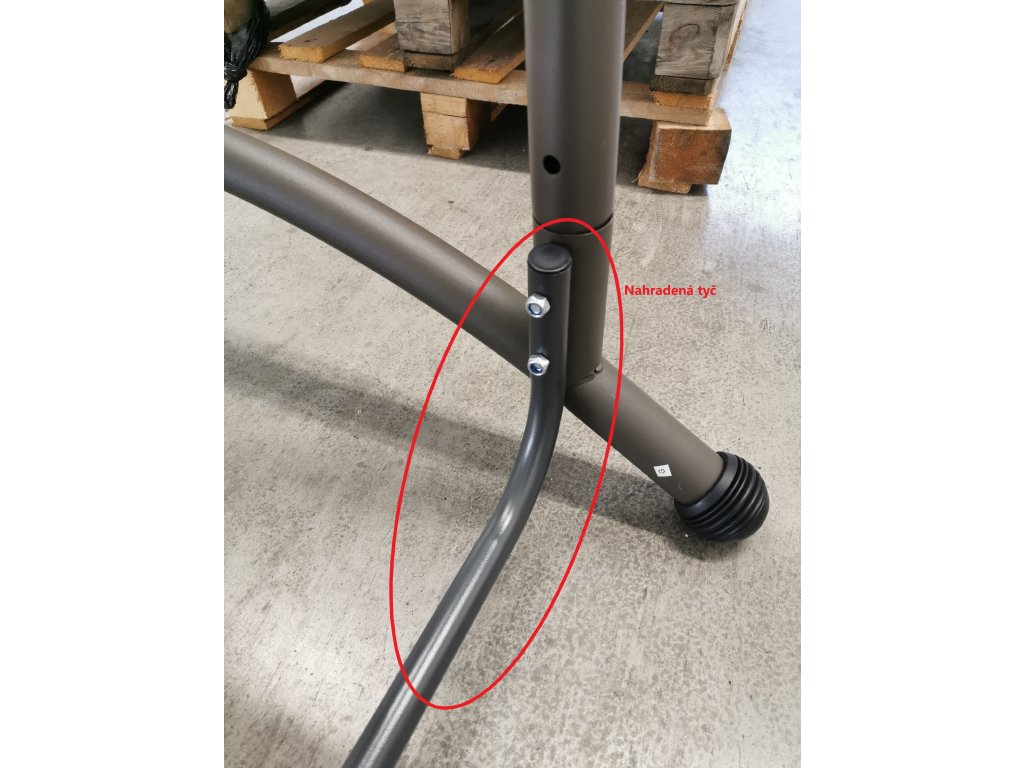 Záhradná hojdačka DUVLAN Lorretta bola vystavená na predajni a následne bola zložená späť do krabice. Na hojdačke bol vymenený jeden diel - spodná kovová tyč.