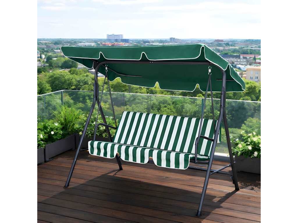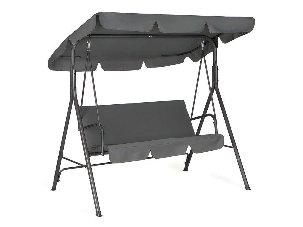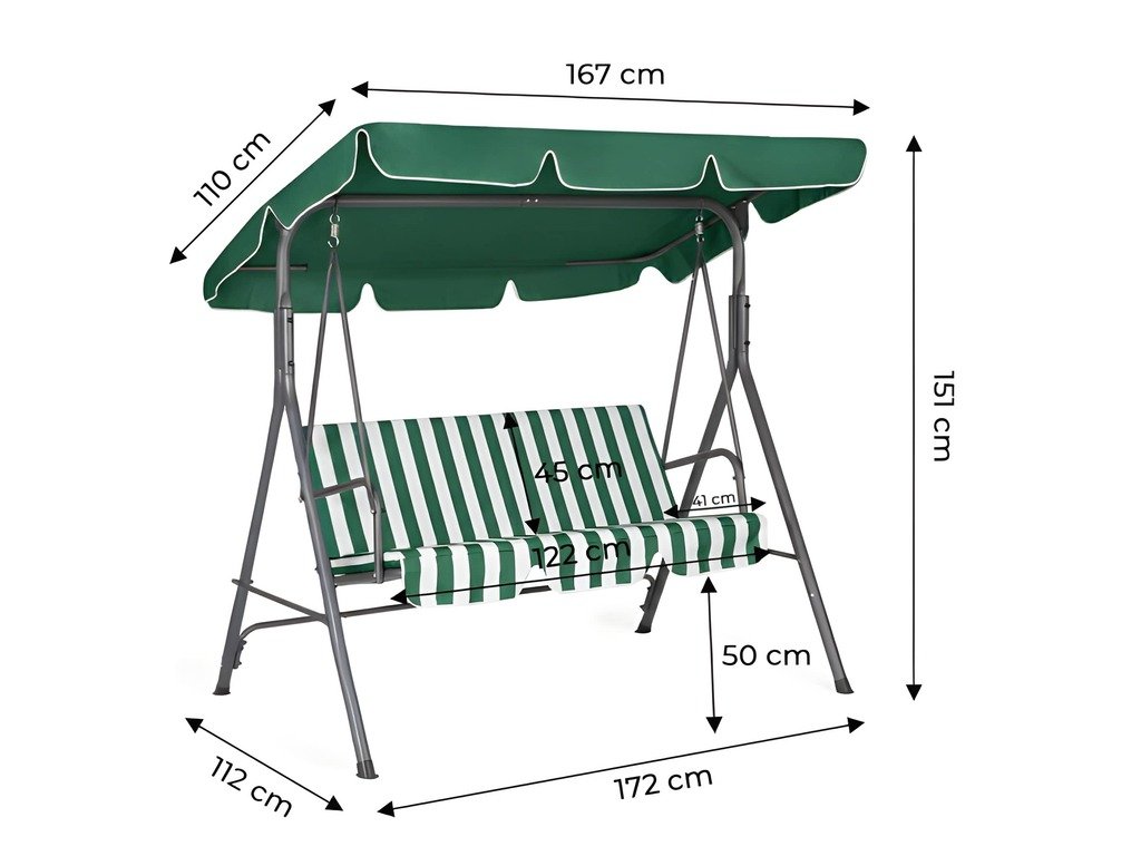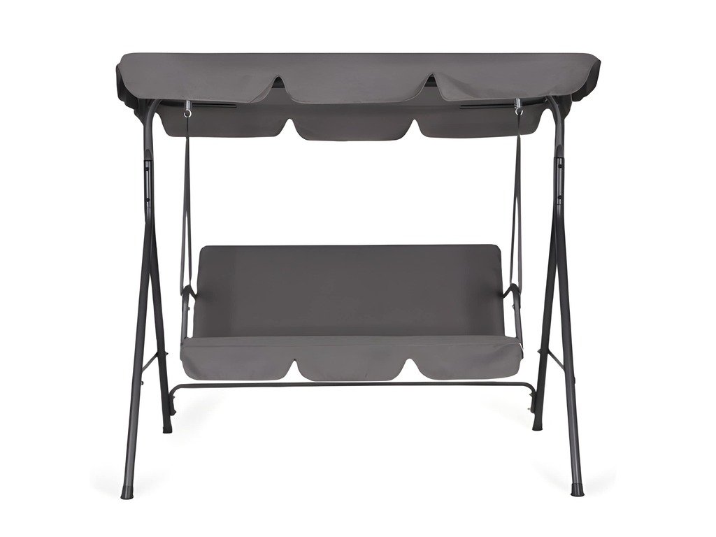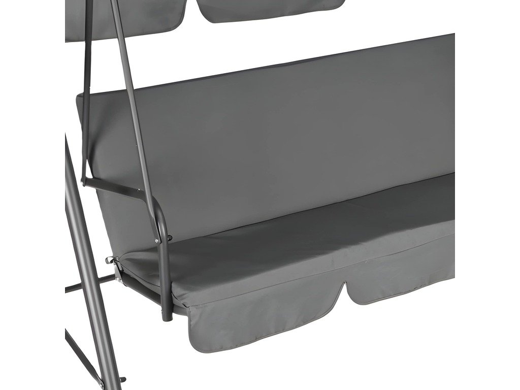 Táto záhradná hojdačka je určená do záhrad, na terasy a záhradky a poskytuje pohodlné miesto na oddych pre tri osoby. Jej odolný oceľový rám zaisťuje stabilitu a odolnosť voči každodennému používaniu a poveternostným podmienkam. Sedadlo a operadlo sú vyrobené z oxfordskej tkaniny 600D PVC, ktorá je odolná voči oderu, ľahko sa čistí a rýchlo schne. Pružiny poskytujú dodatočné pohodlie a zaisťujú plynulé hojdanie. Hojdačka je vybavená nastaviteľnou polyesterovou strieškou s gramážou 140 g/m² s ozdobným volánom, ktorý chráni pred slnkom a slabým dažďom. Protišmykové podložky zlepšujú stabilitu a chránia podlahu. Maximálna nosnosť je 260 kg.