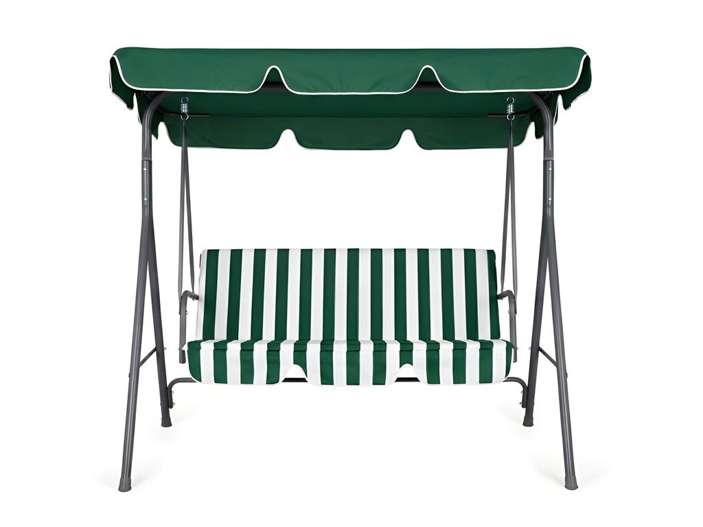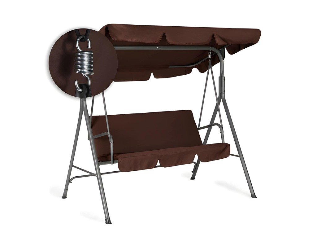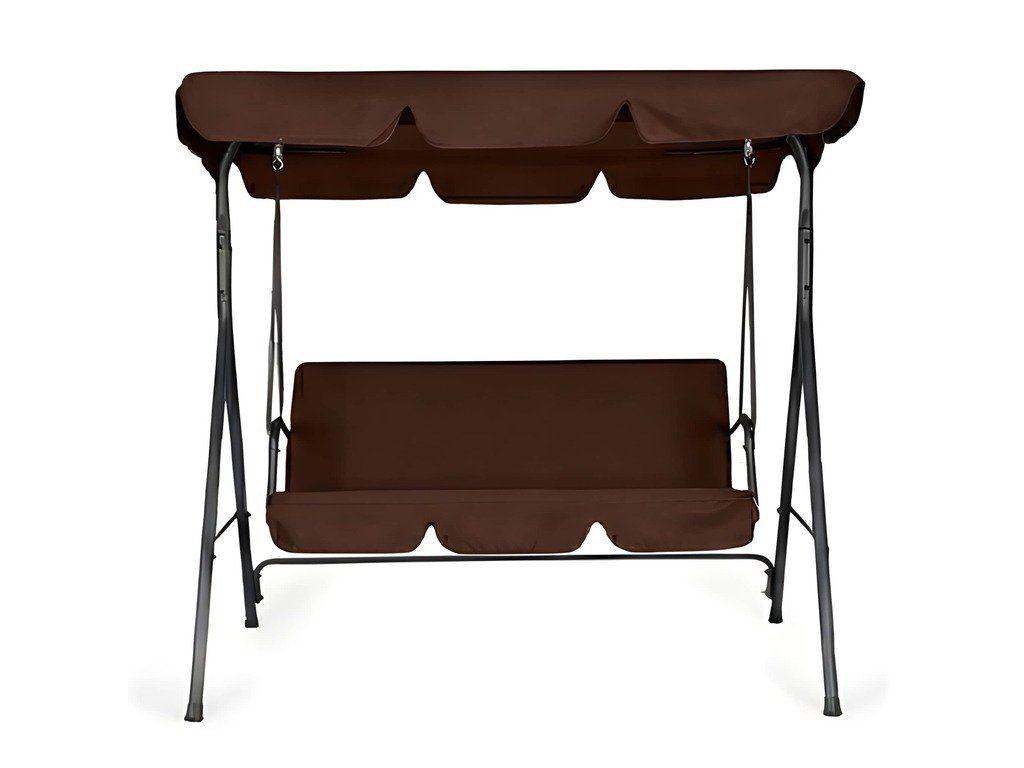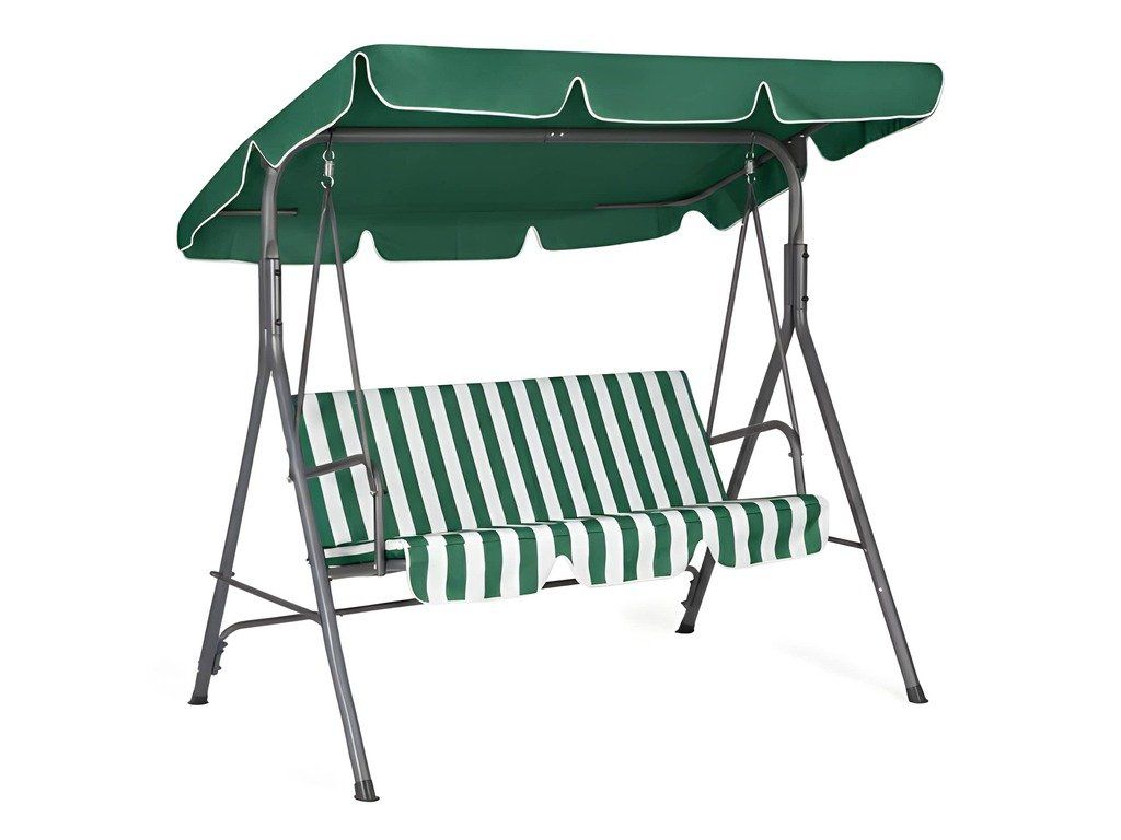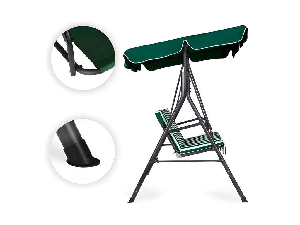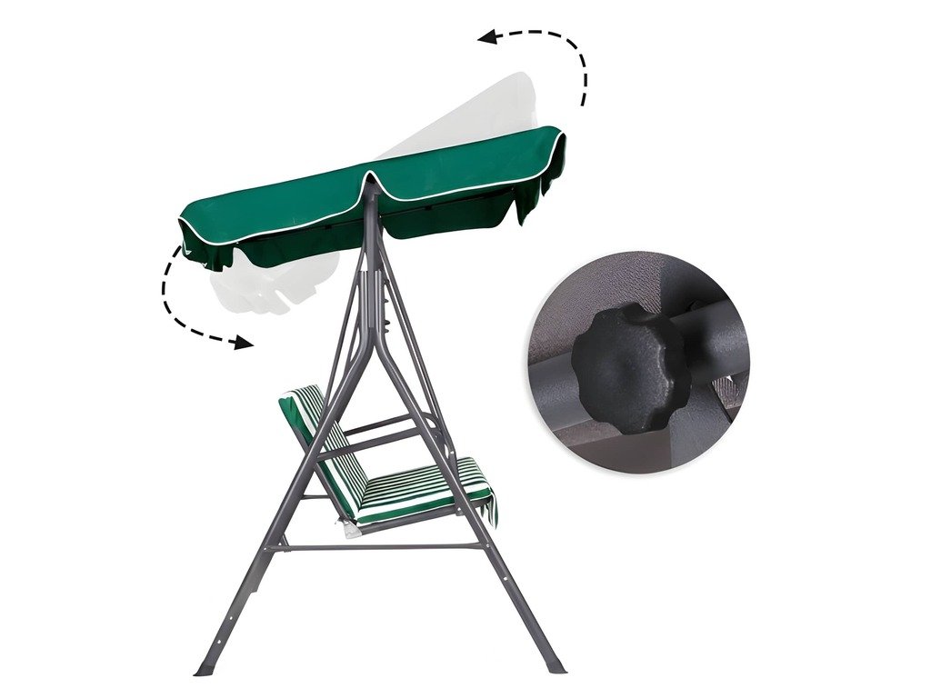 Táto záhradná hojdačka je určená do záhrad, na terasy a záhradky a poskytuje pohodlné miesto na oddych pre tri osoby. Jej odolný oceľový rám zaisťuje stabilitu a odolnosť voči každodennému používaniu a poveternostným podmienkam. Sedadlo a operadlo sú vyrobené z oxfordskej tkaniny 600D PVC, ktorá je odolná voči oderu, ľahko sa čistí a rýchlo schne. Pružiny poskytujú dodatočné pohodlie a zaisťujú plynulé hojdanie. Hojdačka je vybavená nastaviteľnou polyesterovou strieškou s gramážou 140 g/m² s ozdobným volánom, ktorý chráni pred slnkom a slabým dažďom. Protišmykové podložky zlepšujú stabilitu a chránia podlahu. Maximálna nosnosť je 260 kg.