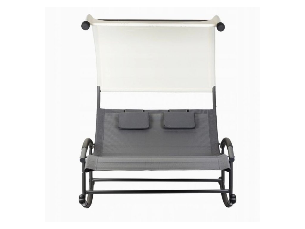 Veľká strieška poskytuje ochranu pred škodlivými UV lúčmi a vytvára príjemný tieň. Celá konštrukcia je odolná voči vonkajším poveternostným podmienkam. Rám kresla je vyrobený z ocele s práškovým nástrekom a materiál lehátka je vyrobený zo špeciálnej tkaniny, ktorá umožňuje priechod vody. Lehátko je naviac vybavené dvomi mäkkými opierkami hlavy a kolieskami, ktoré umožňujú pohyb celej konštrukcie.