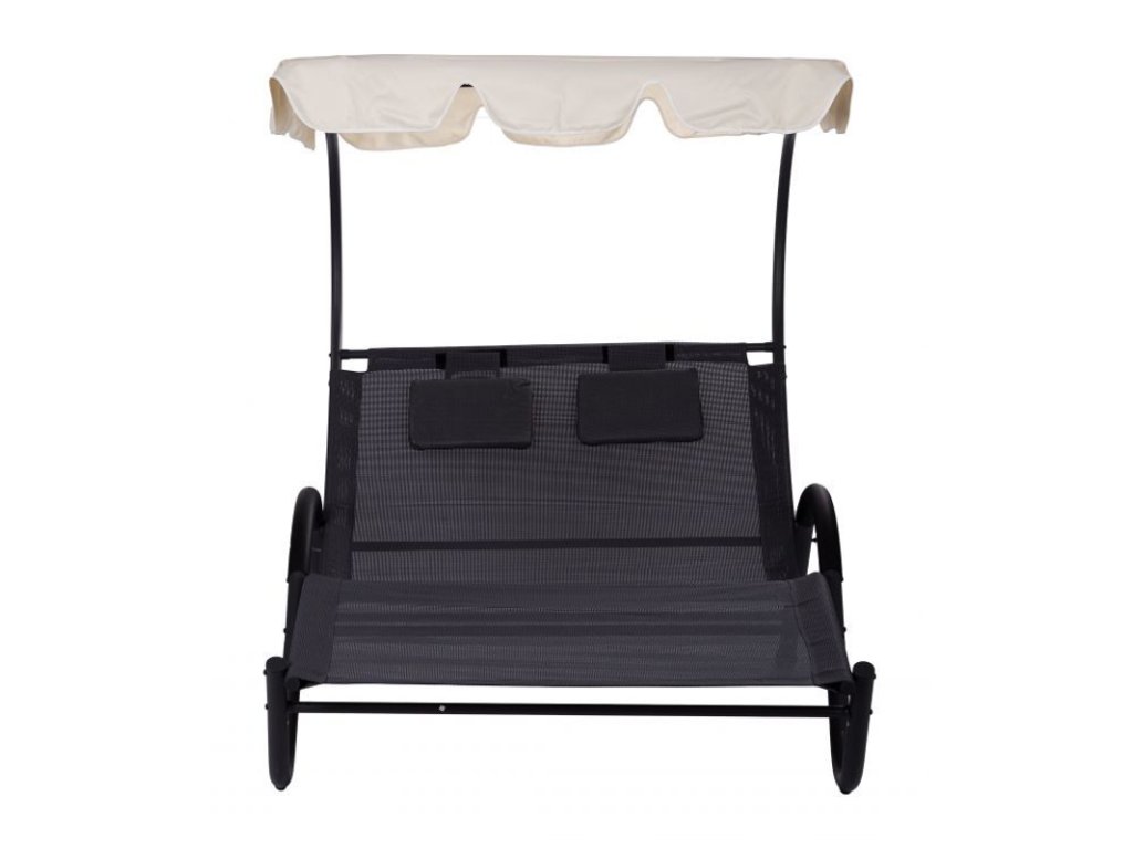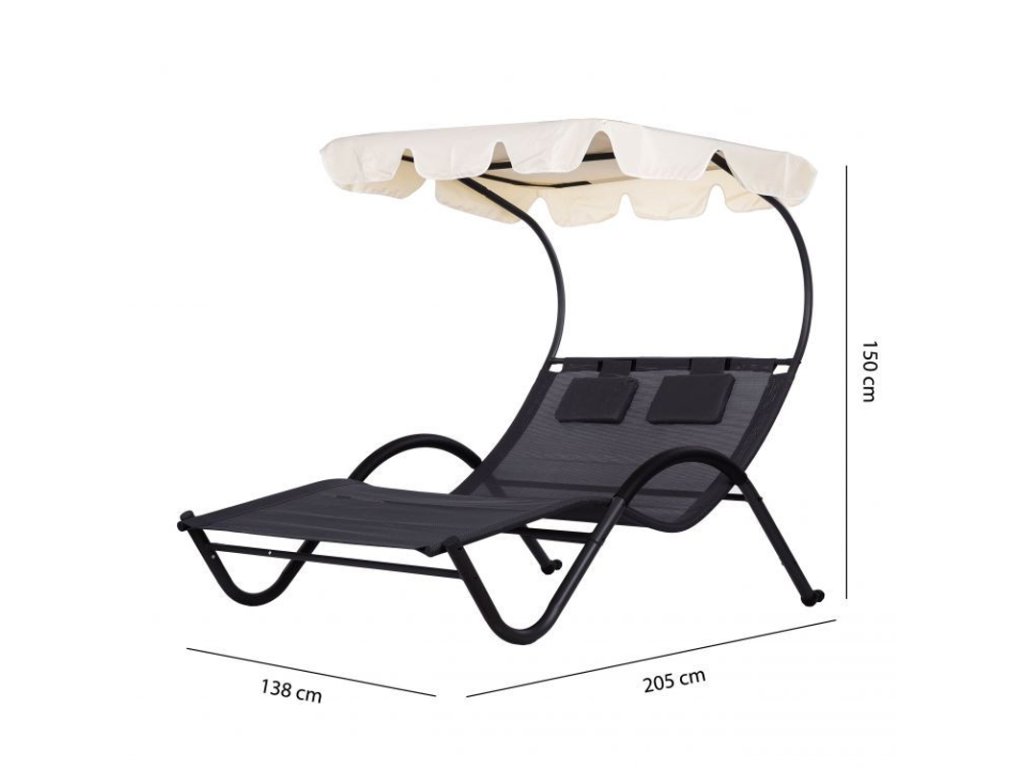 Na záhradnom lehátku PL303 môžu ležať dvaja ľudia súčasne, a to vďaka veľkým rozmerom lehátka: 138 x 205 x 150 cm. Sada obsahuje dva mäkké vankúše. Rám lehátka je vyrobený z ocele s práškovým nástrekom, preto má vysokú odolnosť proti poveternostným podmienkam. Priemery použitých rúrok sú 48 a 32 mm a maximálne zaťaženie je 200 kg. Lehátko je navyše vybavené veľkou nastaviteľnou slnečnou strieškou, ktorá chráni počas slnečných dní pred UV žiarením a poskytuje príjemný tieň. Malé kolieska pripevnené k nohám umožnia ľahký presun lehátka.