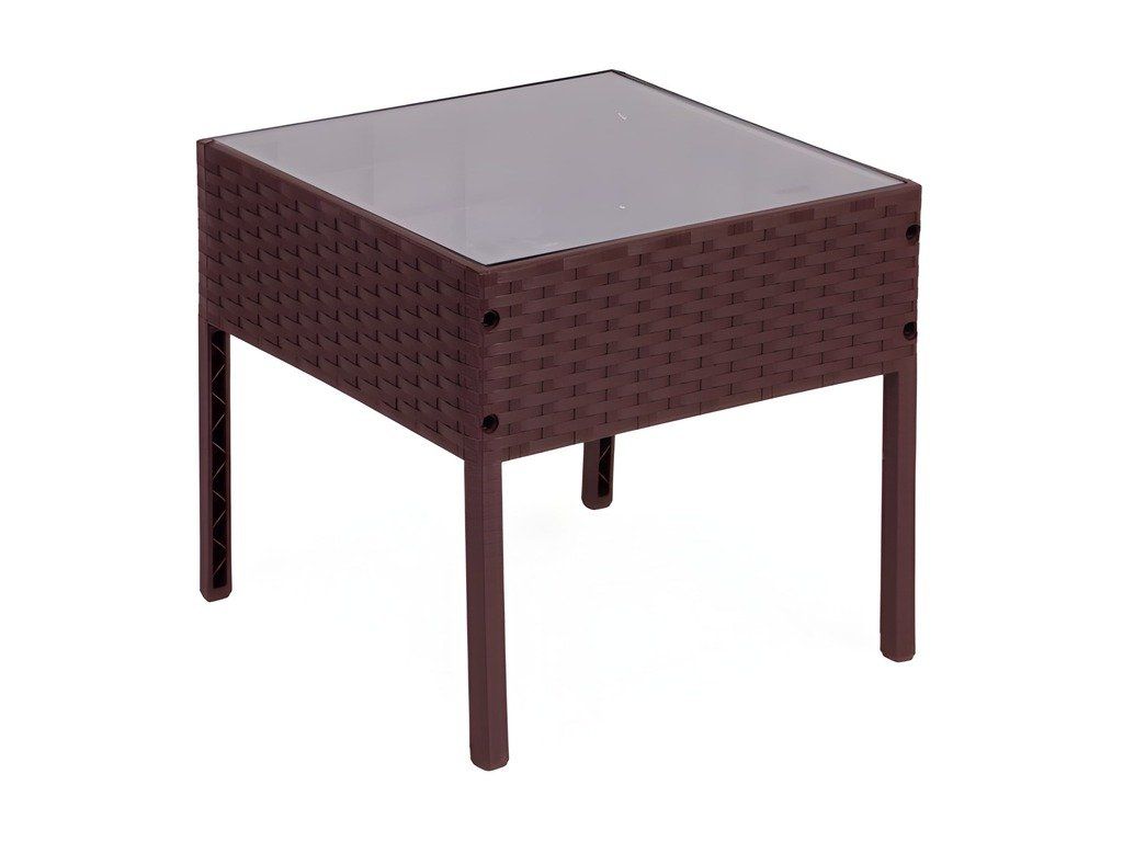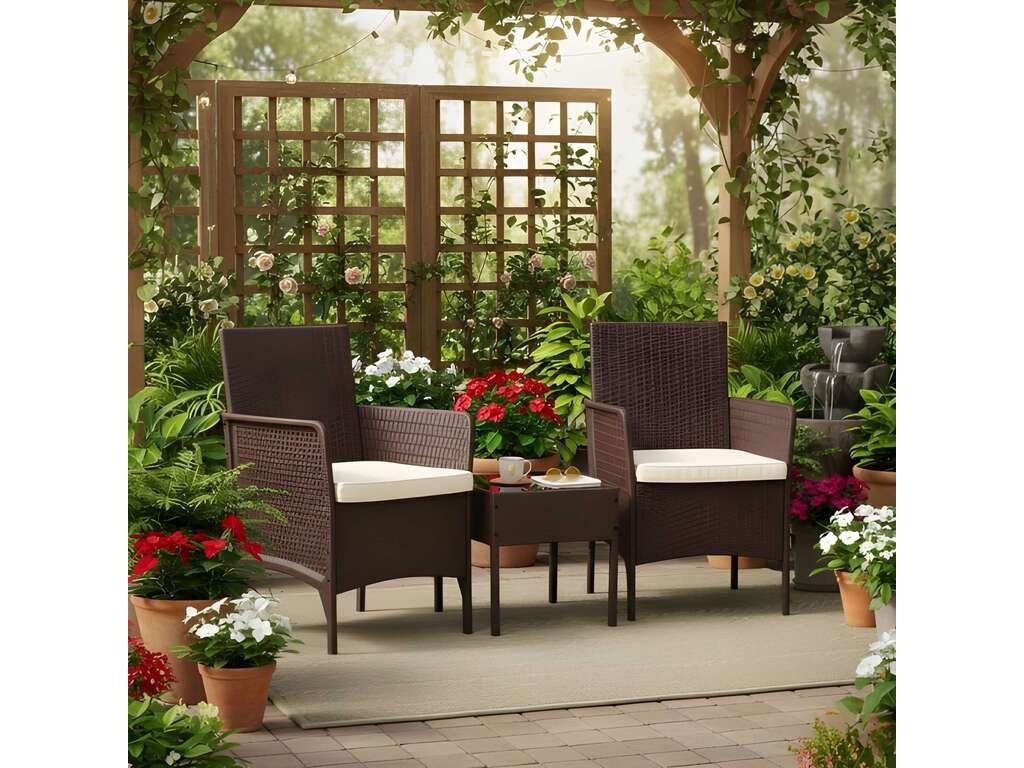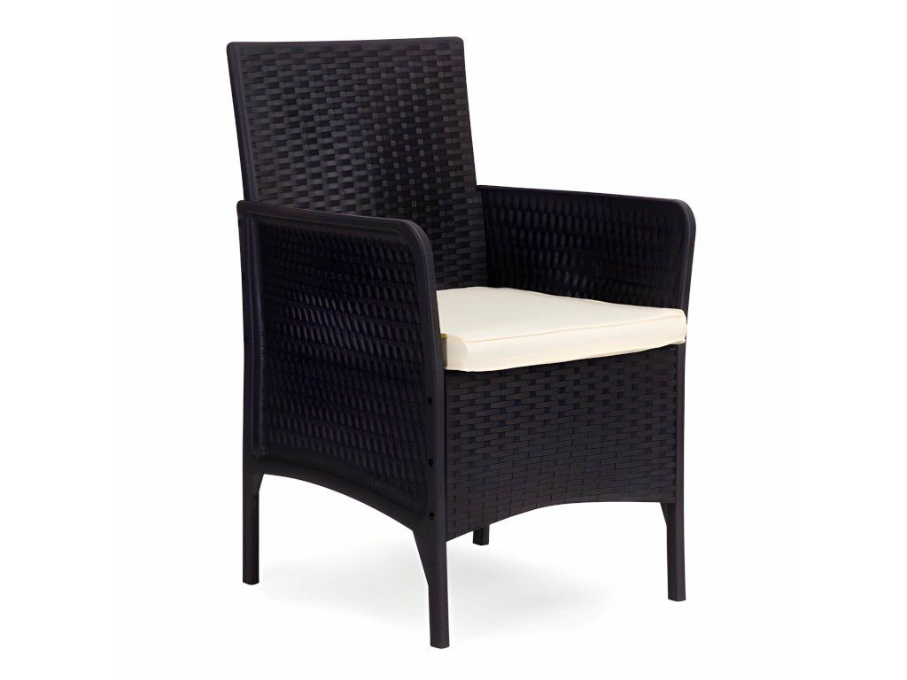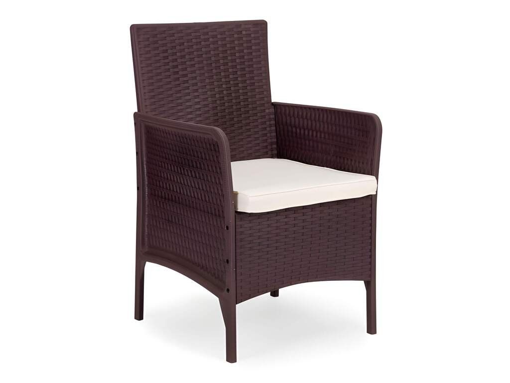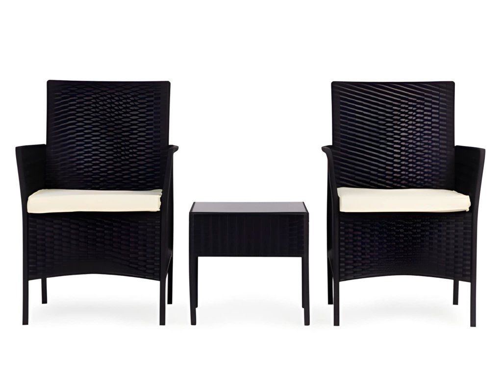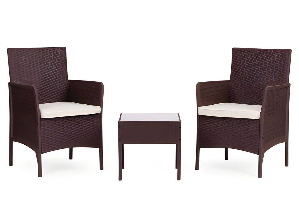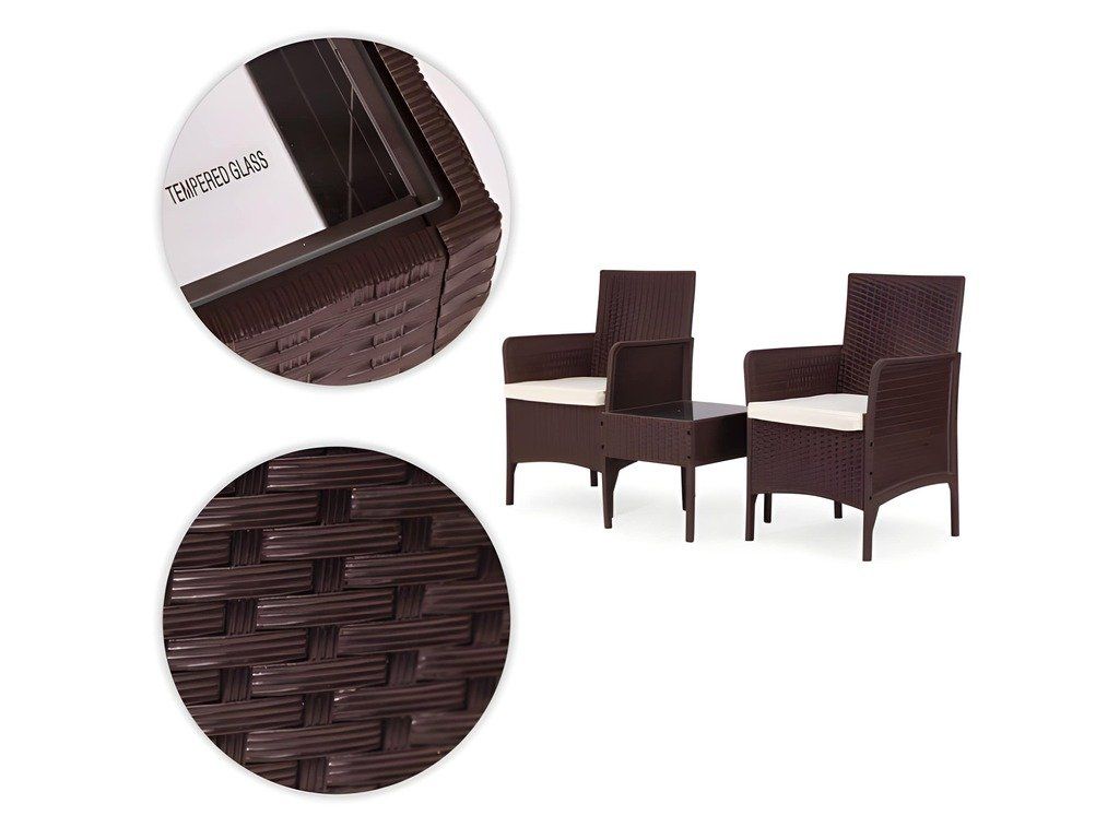 Táto štýlová záhradná súprava nábytku sa skladá z dvoch kresiel a stola. Robustná plastová konštrukcia s povrchom imitujúcim prírodný ratan zaisťuje odolnosť voči poveternostným vplyvom, dlhú životnosť a jednoduché čistenie. Doska stola je vyrobená z 5 mm hrubého tvrdeného skla, ktoré zaisťuje vysokú odolnosť voči poškodeniu. Súprava obsahuje mäkké vankúše vyrobené z vodeodolného polyesteru s gramážou 160 g/m² (hrúbka 4 cm). Stolička má maximálnu nosnosť 150 kg .