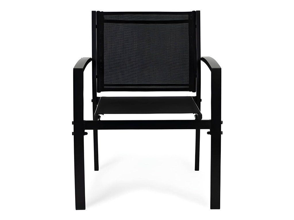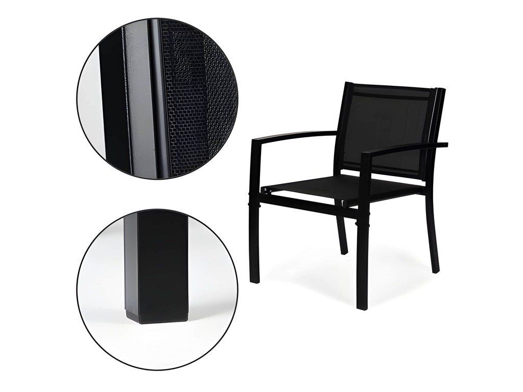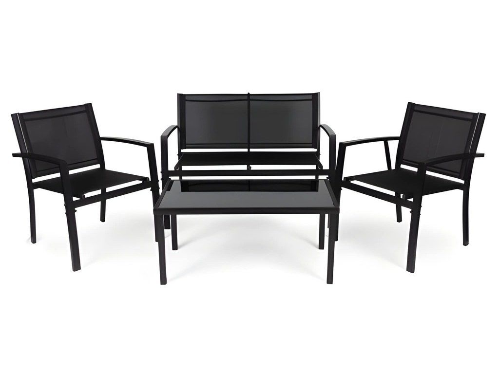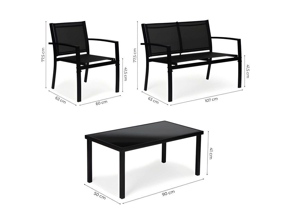 Vďaka jednoduchému dizajnu sa tento nábytok perfektne hodí do moderných relaxačných priestorov. Nielenže dodá jedinečný charakter, ale poskytne aj pohodlné miesto na relaxáciu počas letných dní. Masívna kovová konštrukcia robí nábytok stabilným a odolným, čo zaručuje jeho trvácnosť po mnoho sezón. Na operadlá a sedadlá sa používa špeciálny materiál (textilín), ktorý je vysoko odolný a odolný voči poveternostným vplyvom. Sieťovaný materiál sa ľahko udržiava, dokonale sa prispôsobí telu a čo je dôležité, zaisťuje správne vetranie. Doska stola je vyrobená z čierneho tvrdeného skla, čo dodáva stolu exkluzívny charakter a robí ho odolným a ľahko udržiavateľným. Súprava obsahuje dve stoličky, lavicu a malý stolík.