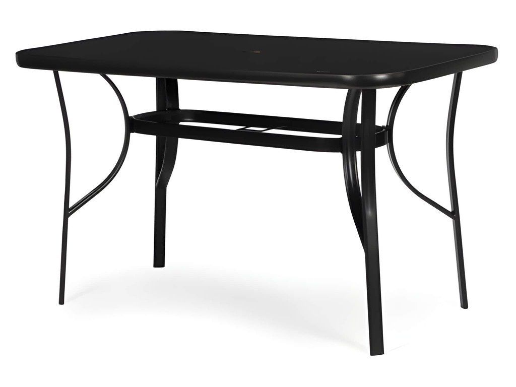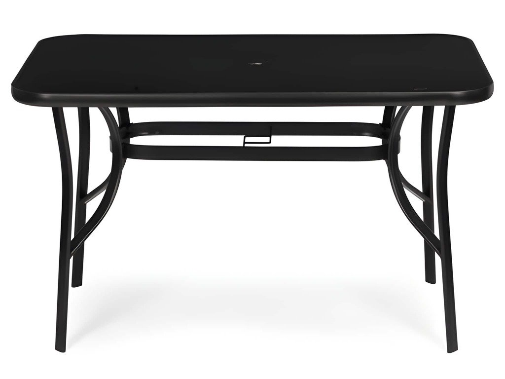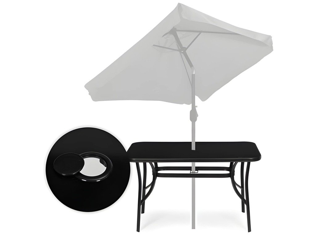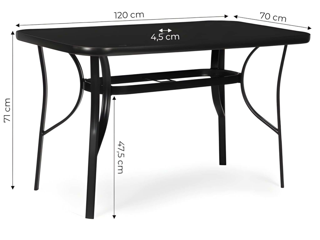 Tento záhradný stôl MultiGarden má obdĺžnikovú dosku s rozmermi 120x70 cm, ktorá poskytuje pohodlný a funkčný priestor na odloženie nápojov a príslušenstva. Doska stola z tvrdeného skla je odolná voči mechanickému poškodeniu a poveternostným podmienkam. Hladký povrch sa ľahko udržiava v čistote, zatiaľ čo čierny rám spevňuje hrany a zvyšuje odolnosť celej konštrukcie. Doska stola má hrúbku 4 cm. Stabilitu zaisťuje základňa vyrobená z oceľových profilov s práškovou farbou, ktoré sú účinne chránené pred koróziou a vlhkosťou. Konštrukciu ďalej spevňuje spojka a protišmykové nožičky chránia podlahu pred poškriabaním. Na stôl sa vďaka špeciálnym otvorom v doske stola a spojkám v nohách (priemer otvoru: 4,5 cm) zmestí slnečník. Keď slnečník nie je potrebný, otvor je možné úhľadne zakryť priloženou krytkou. Maximálna nosnosť stola je 60 kg.