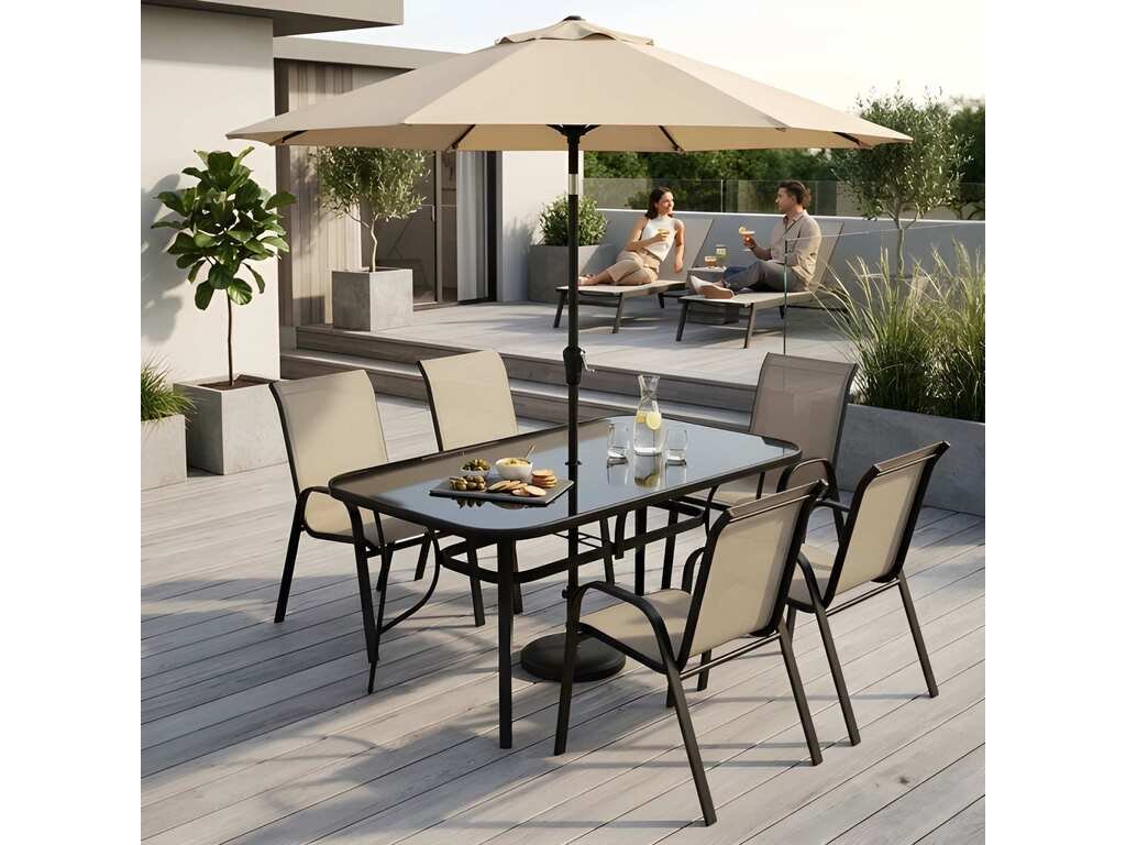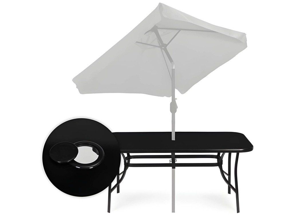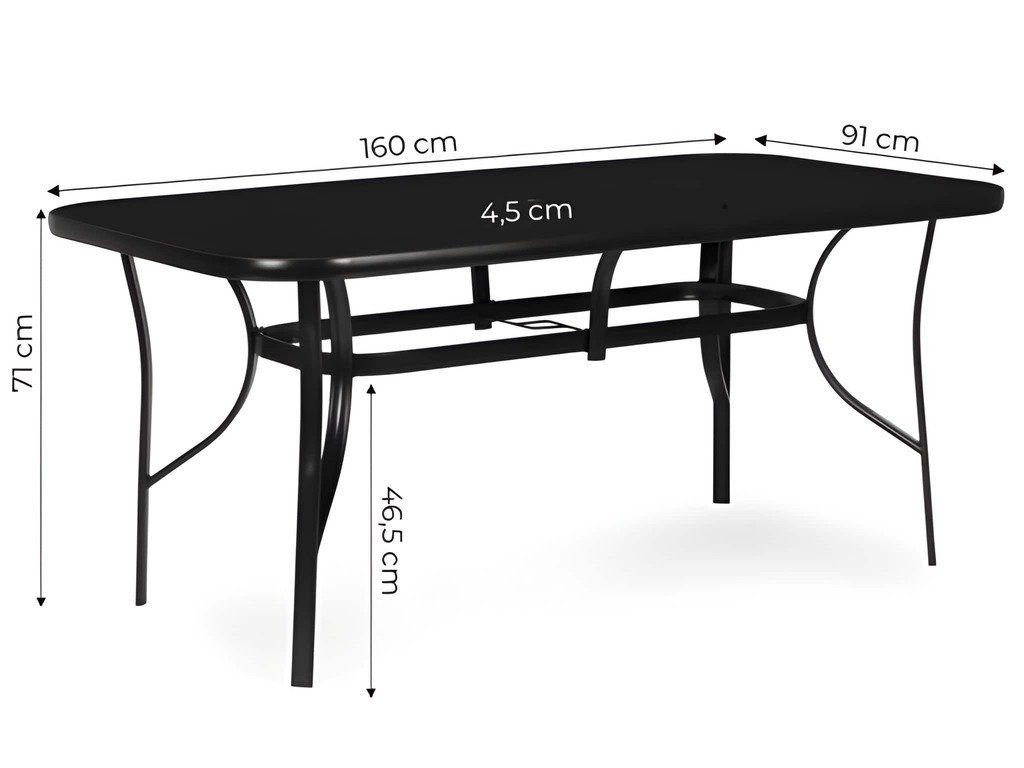 Tento záhradný stôl MultiGarden má obdĺžnikovú dosku s rozmermi 160x90 cm, ktorá poskytuje pohodlný a funkčný priestor na odloženie nápojov a príslušenstva. Doska stola z tvrdeného skla je odolná voči mechanickému poškodeniu a poveternostným podmienkam. Hladký povrch sa ľahko udržiava v čistote, zatiaľ čo čierny rám spevňuje hrany a zvyšuje odolnosť celej konštrukcie. Doska stola má hrúbku 4 cm. Stabilitu zaisťuje základňa vyrobená z oceľových profilov s práškovou farbou, ktoré sú účinne chránené pred koróziou a vlhkosťou. Konštrukciu ďalej spevňuje spojka a protišmykové nožičky chránia podlahu pred poškriabaním. Na stôl sa vďaka špeciálnym otvorom v doske stola a spojkám v nohách (priemer otvoru: 4,5 cm) zmestí slnečník. Keď slnečník nie je potrebný, otvor je možné úhľadne zakryť priloženou krytkou. Maximálna nosnosť stola je 60 kg.