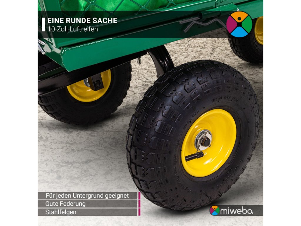 Skvelá jazda po celý deň: 10-palcové pneumatiky s oceľovými ráfikmi zaisťujú mimoriadne dobré odpruženie. Vďaka tomu je ručný vozík Miweba MB-550 vhodný na mnohé povrchy. flexibilne sa prispôsobí nerovným podlahám. Nezastaví ho ani piesok či mäkká pôda.