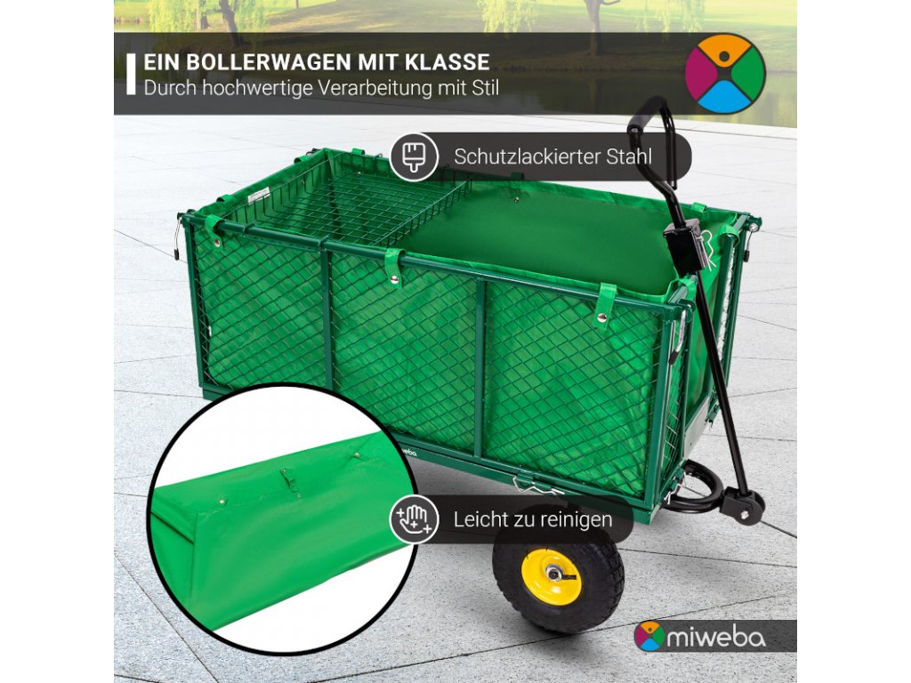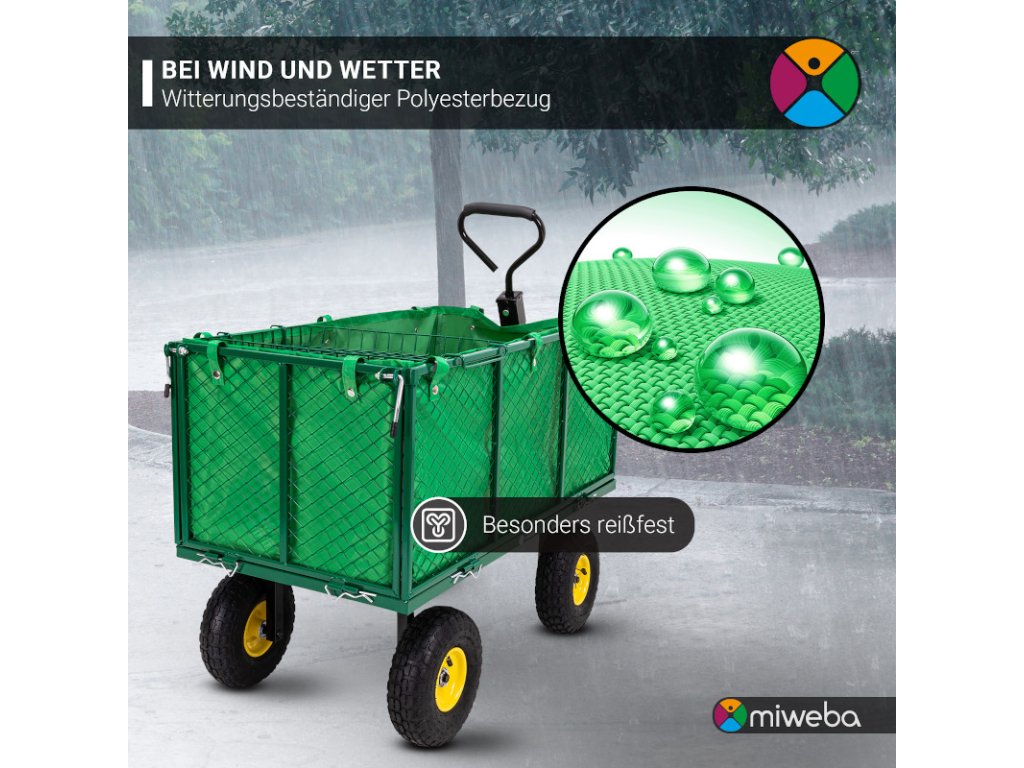 Odnímateľný poťah ručného vozíka Miweba MB-550 je vyrobený z polyesteru. Vlákna sú obzvlášť odolné voči roztrhnutiu a zároveň poveternostným vplyvom. Keďže absorbujú málo vody, čistenie je hrou. Jednoducho zložte kryt zo záhradného vozíka, utiahnite hadicu a nechajte vyschnúť na slnku. Odolnejšie nečistoty môžete odstrániť špongiou a trochou saponátu.