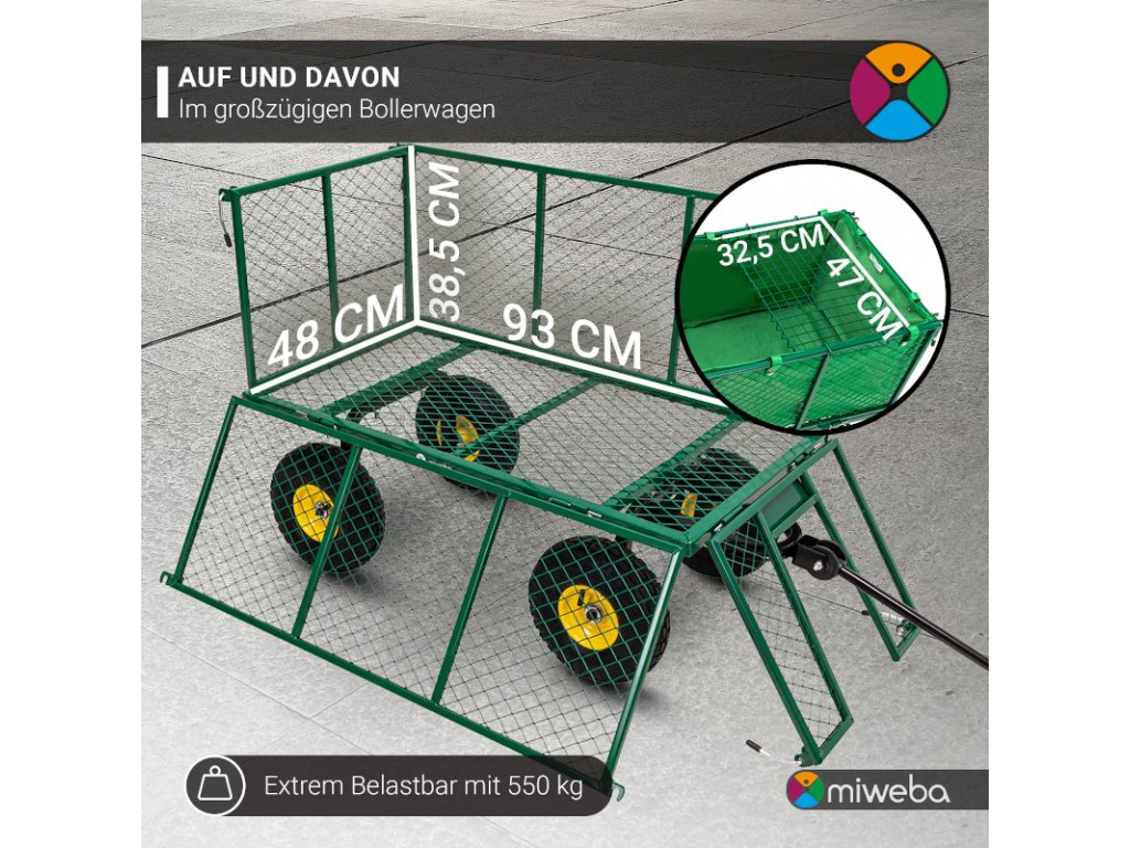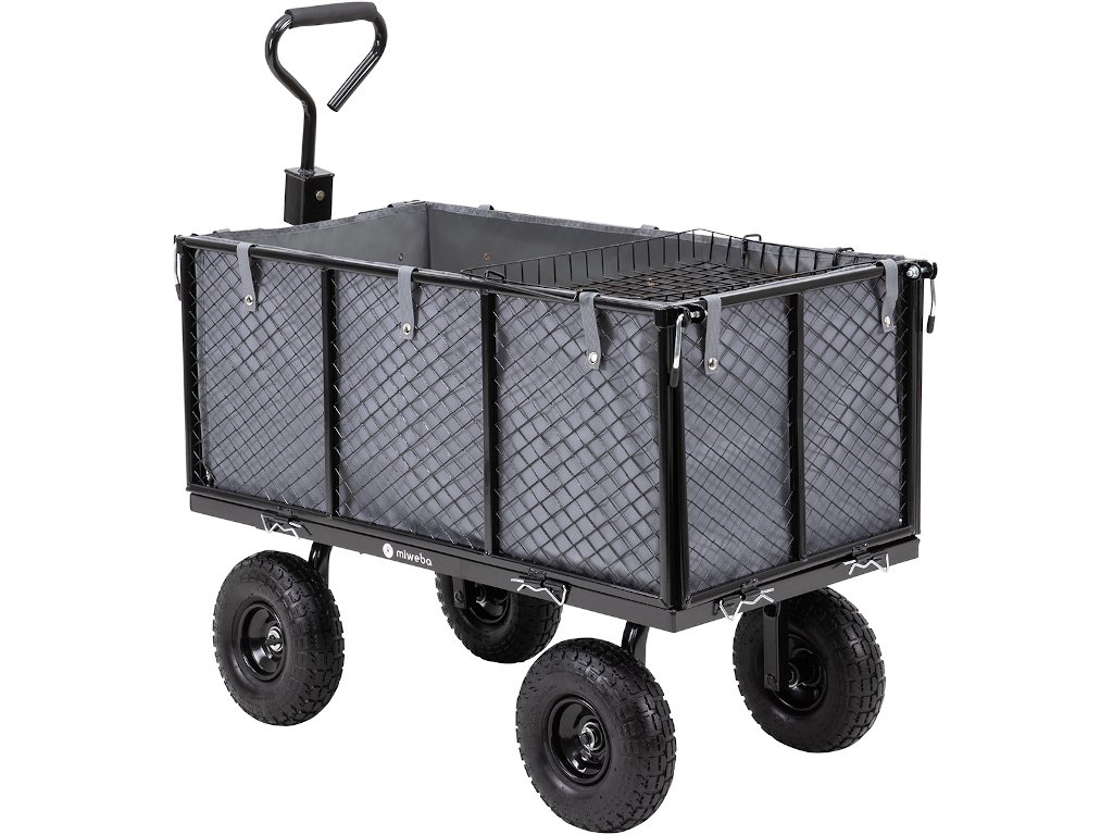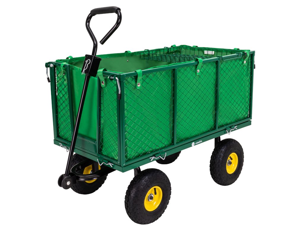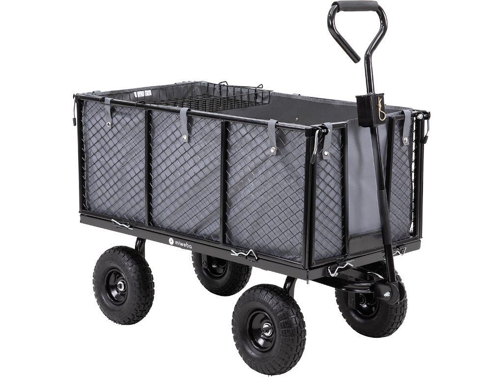 Úložná plocha 93 x 48 x 38,5 cm ponúka dostatok priestoru pre všetky druhy vecí. Na prídavnej poličke s rozmermi 32,5 x 47 x 4 cm pohodlne uložíte ďalšie drobnosti ako napríklad náradie. A čo je najlepšie: steny sa dajú zložiť alebo úplne vybrať, čím získate ešte viac priestoru. To vám umožní ľahko prepravovať ťažký tovar počas práce na záhrade alebo priniesť nápoje domov po nákupe. Bez namáhavého ťahania! Prepravný vozík sa vyznačuje vysokou nosnosťou 550 kg a objemom 190 litrov.