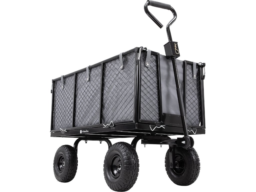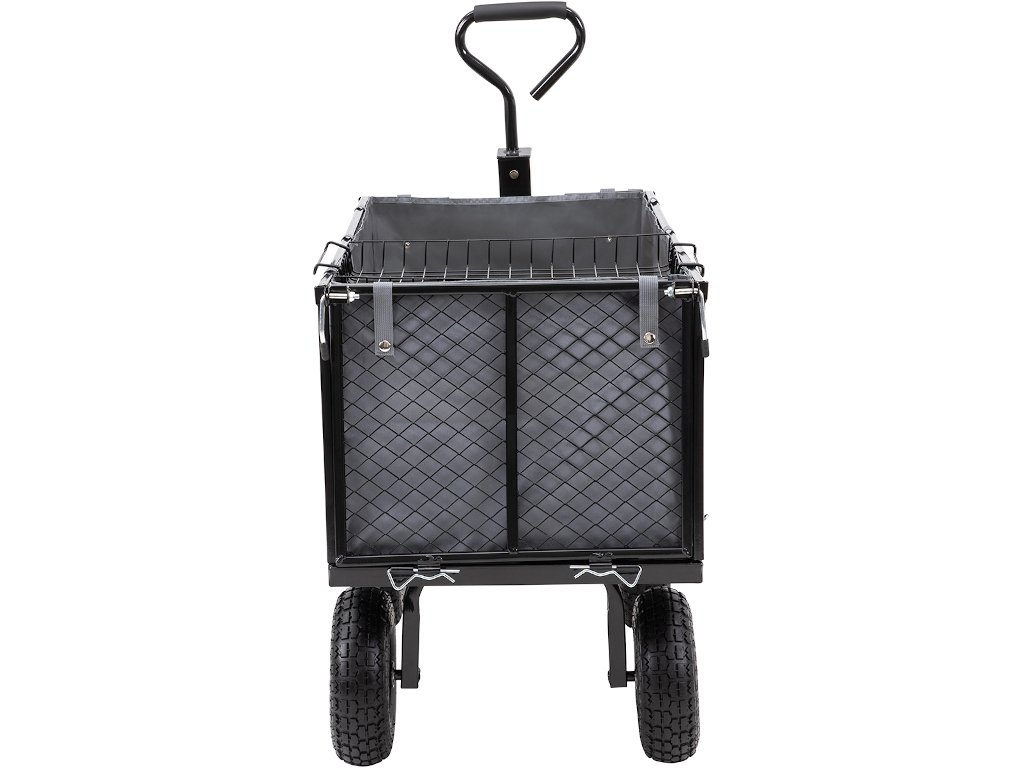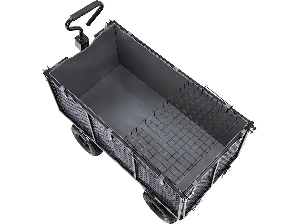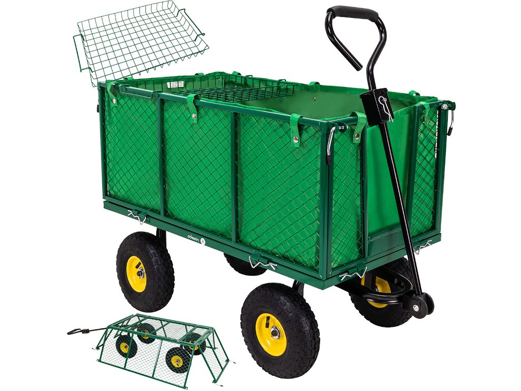 Úložná plocha 93 x 48 x 38,5 cm ponúka dostatok priestoru pre všetky druhy vecí. Na prídavnej poličke s rozmermi 32,5 x 47 x 4 cm pohodlne uložíte ďalšie drobnosti ako napríklad náradie. A čo je najlepšie: steny sa dajú zložiť alebo úplne vybrať, čím získate ešte viac priestoru. To vám umožní ľahko prepravovať ťažký tovar počas práce na záhrade alebo priniesť nápoje domov po nákupe. Bez namáhavého ťahania! Prepravný vozík sa vyznačuje vysokou nosnosťou 550 kg a objemom 190 litrov.