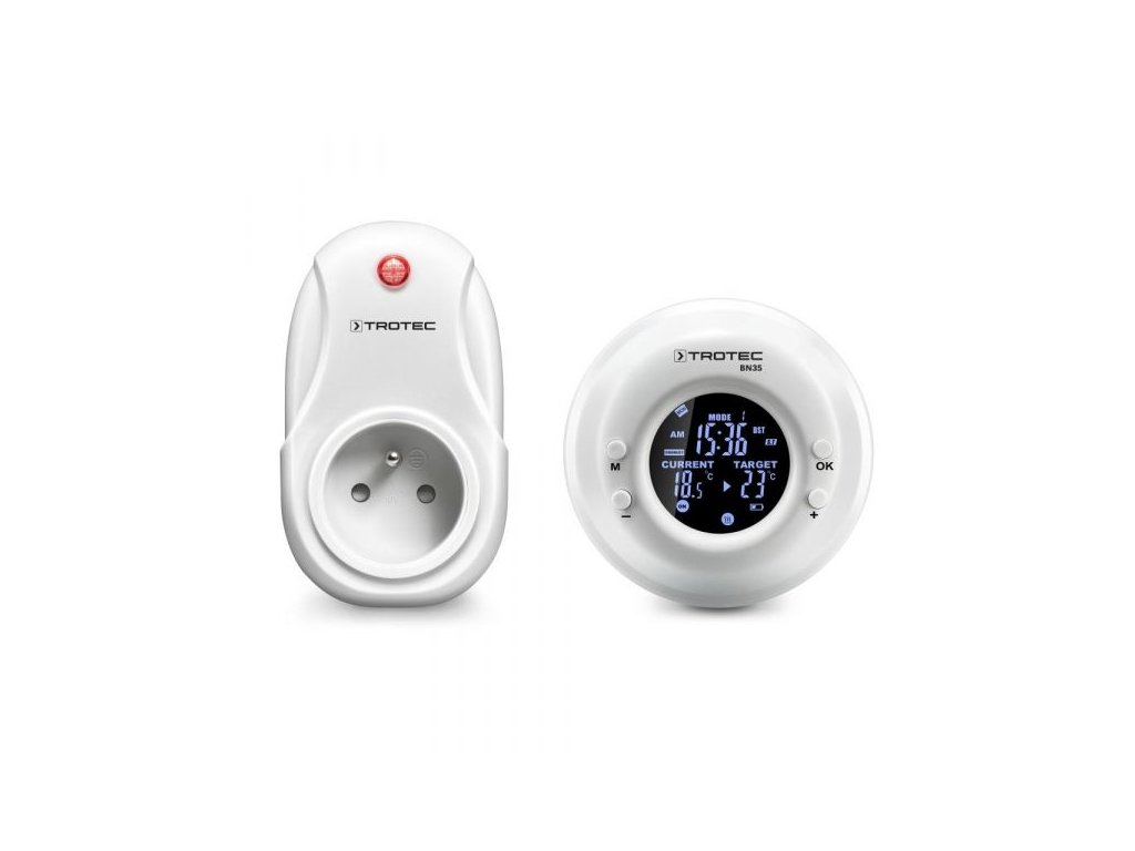 Sada BN35 sa skladá z bezdrôtovej zásuvky a bezdrôtového termostatu. Jednoducho zapojte bezdrôtovú zásuvku do zásuvky v stene a pripojte svoje elektrické zariadenie k zásuvke v bezdrôtovej zástrčke. Pomocou bezdrôtového termostatu môžete teraz vzdialene nastaviť požadovanú teplotu zapnutia alebo vypnutia. Bezdrôtový termostat meria teplotu v miestnosti na aktuálnom mieste a podľa toho zapína alebo vypína kúrenie alebo klimatizáciu, aby dosiahol požadovanú hodnotu teploty v miestnosti. Hneď ako sa dosiahne nastavená teplota v miestnosti, bezdrôtový termostat vypne pripojené elektrické zariadenie, až kým nebude potrebné znovu zohriať alebo ochladiť.