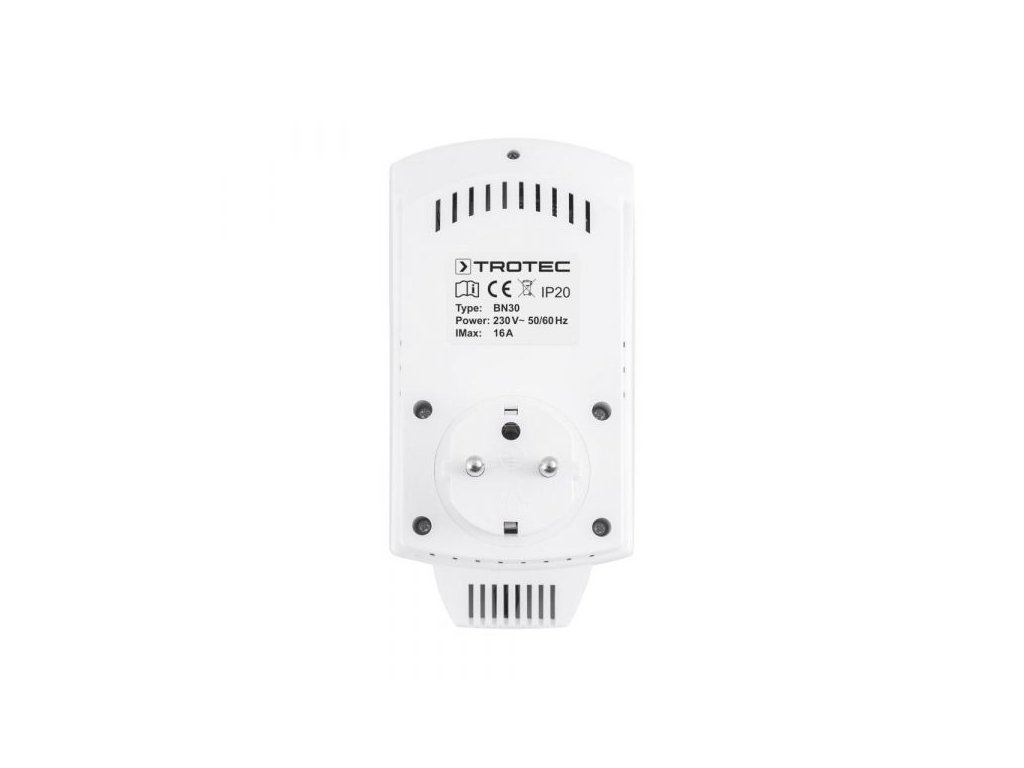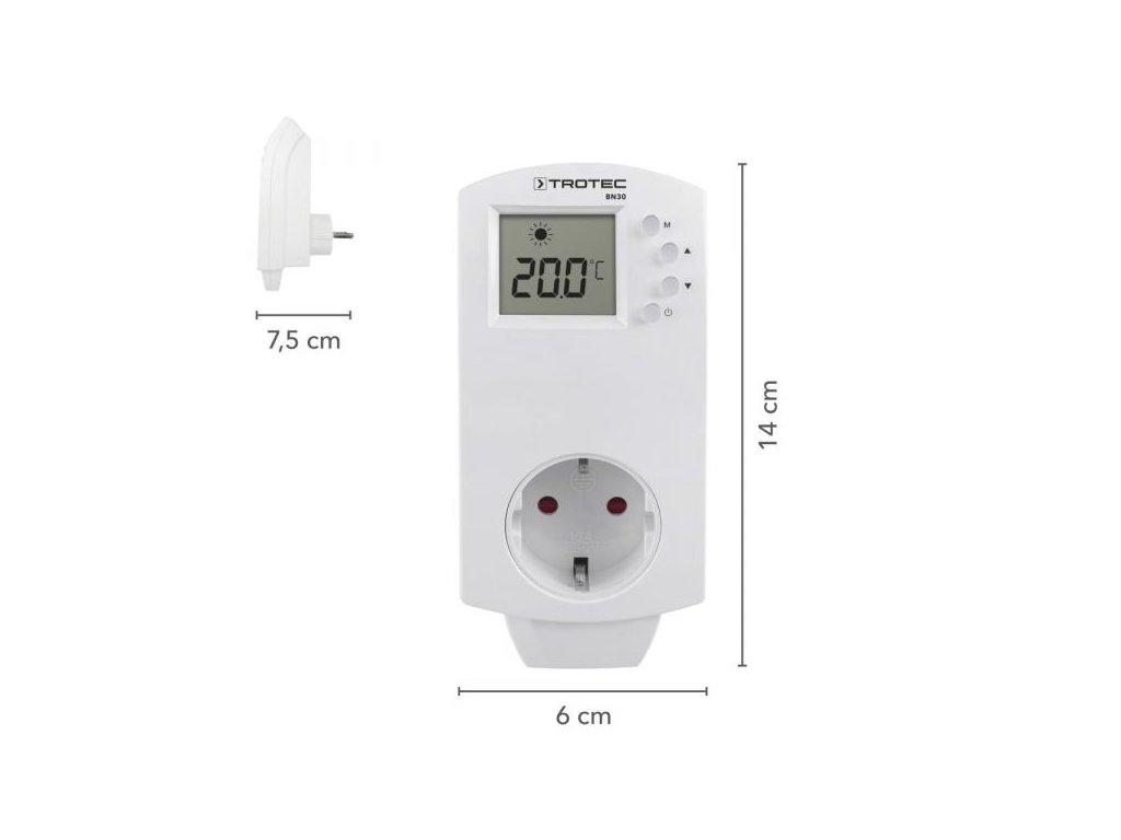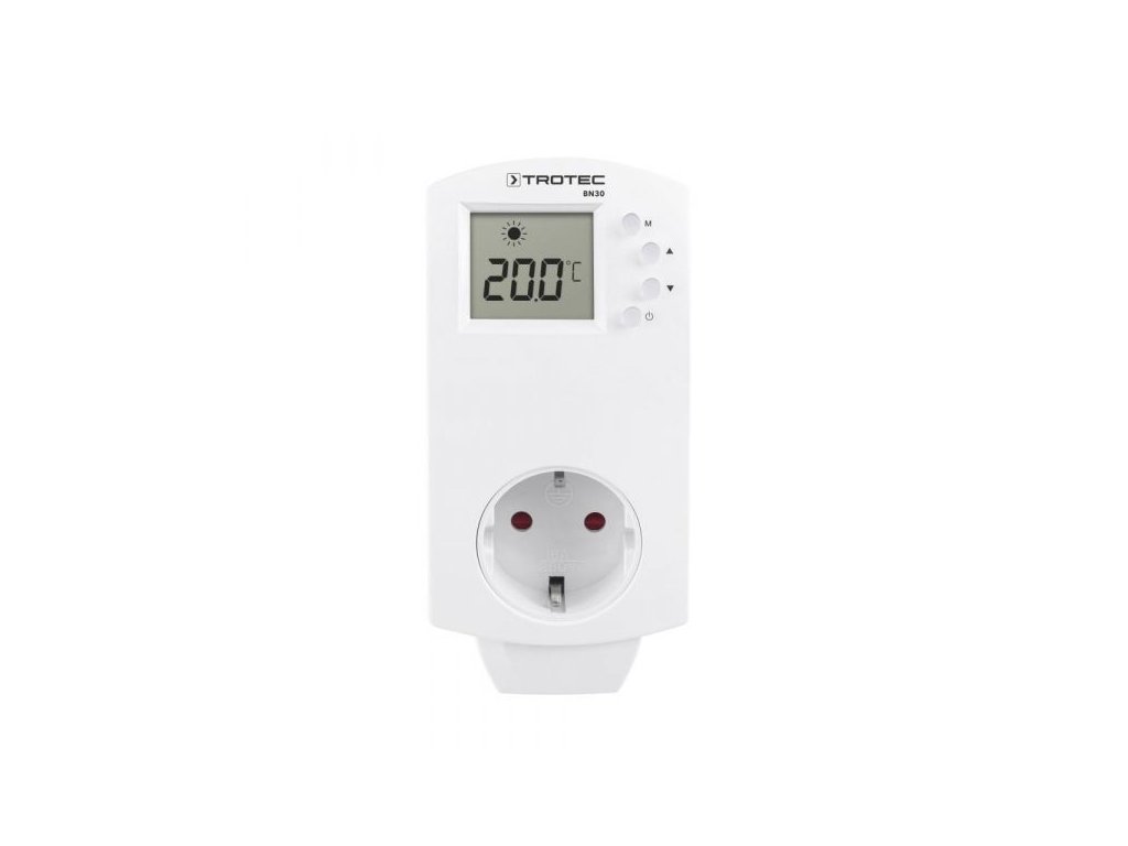 Termostat BN30 umožňuje reguláciu teploty vykurovacích a klimatizačných zariadení v rozmedzí od 5 ° C do 30 ° C v polstupňových krokoch. Za týmto účelom sa zásuvkový termostat jednoducho pripevní medzi vykurovaciu alebo klimatizačnú jednotku a zásuvku a nastaví sa požadovaná teplota. Vďaka integrovanému senzoru meria prístroj skutočnú hodnotu teploty v miestnosti a reguluje vykurovacie alebo klimatizačné zariadenie podľa požadovanej hodnoty.