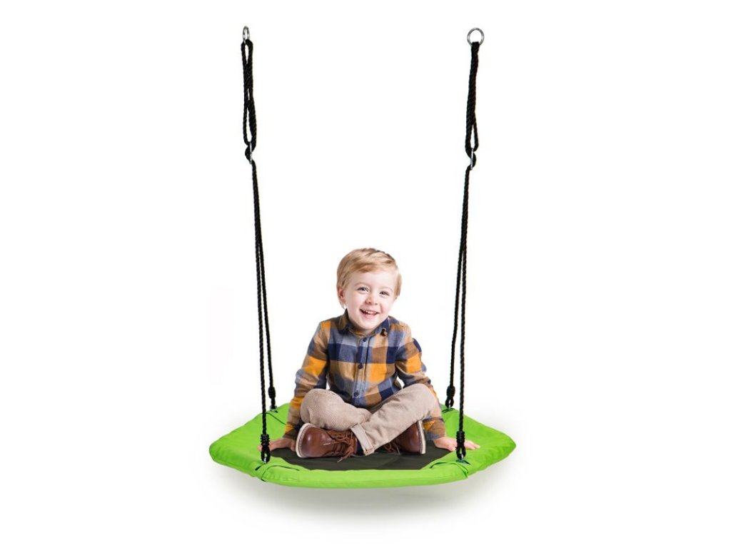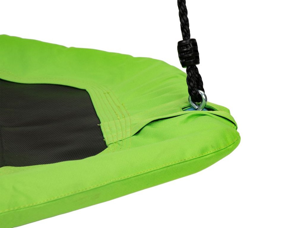 Kovový rám hojdačky je pokrytý mäkkou penou, ktorá zaisťuje bezpečnosť pri hre. Veľké sedadlo 92 cm je vyrobené zo silného „sieťovaného“ materiálu, ktorý zaručuje hodiny zábavy. Hojdačka obsahuje laná s hrúbkou 10 mm a je možné ju upevniť na jednom alebo dvoch bodoch. Dĺžka lán je nastaviteľná, takže ľahko nastavíte jeho výšku. Maximálne zaťaženie je 100 kg. Materiál použitý na výrobu hojdačky zaisťuje jej odolnosť voči poveternostným podmienkam.