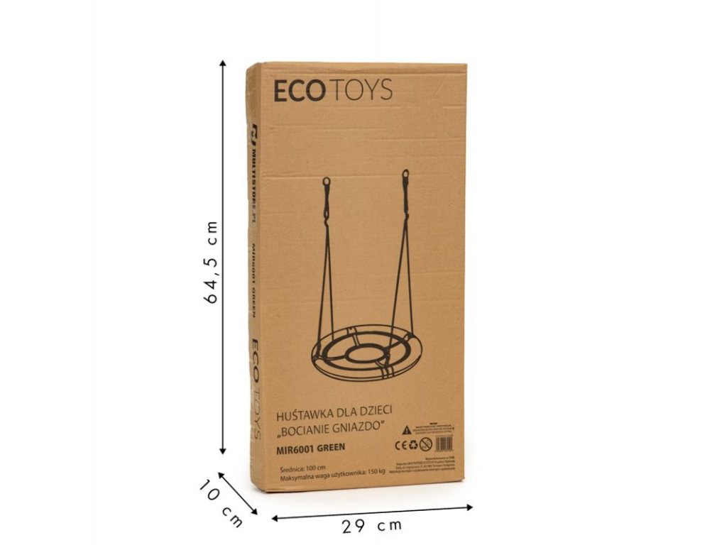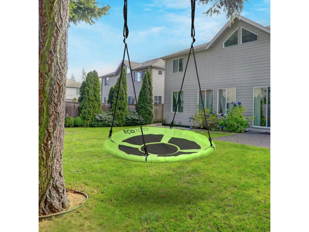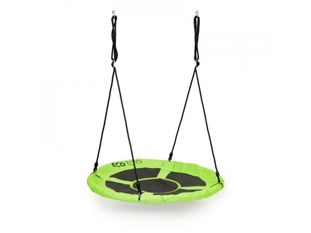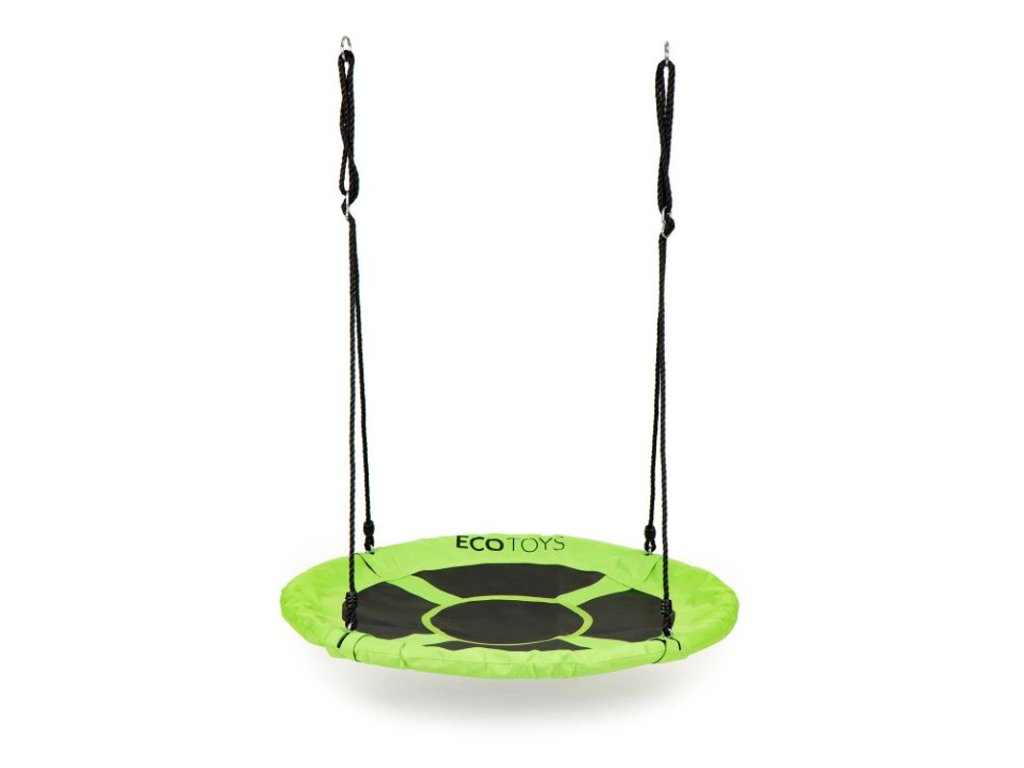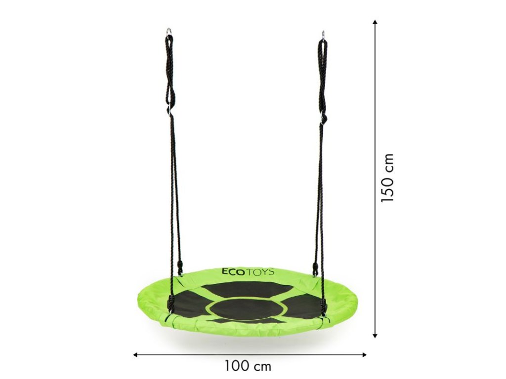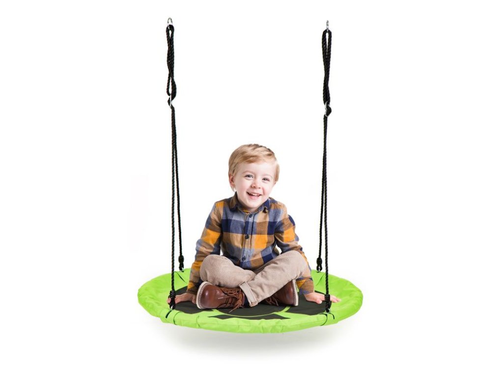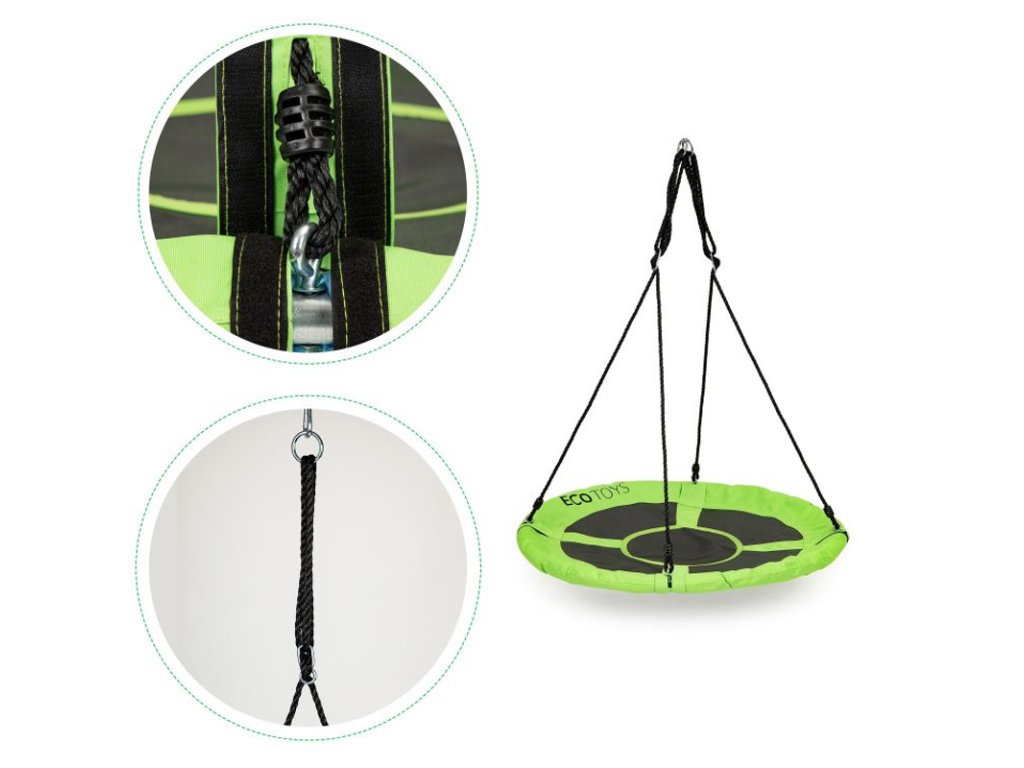 Kovový rám hojdačky je pokrytý mäkkou penou, ktorá zaisťuje bezpečnosť pri hre. Veľké sedadlo s priemerom 100 cm je vyrobené zo silného „sieťovaného“ materiálu, ktorý zaručuje hodiny zábavy. Hojdačka obsahuje laná s hrúbkou 10 mm a je možné ju upevniť na jednom alebo dvoch bodoch. Dĺžka lán je nastaviteľná, takže ľahko nastavíte jeho výšku. Maximálne zaťaženie je 100 kg. Materiál použitý na výrobu hojdačky zaisťuje jej odolnosť voči poveternostným podmienkam.
