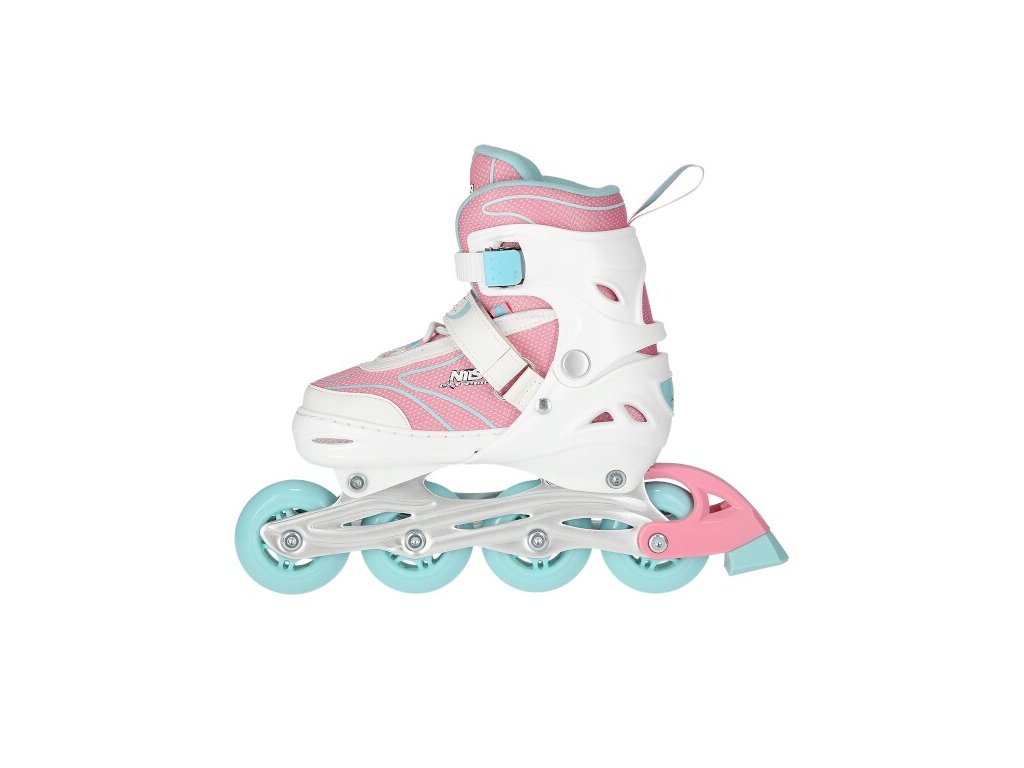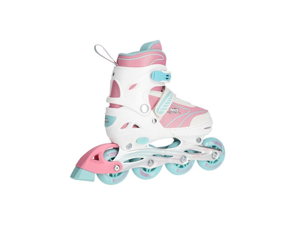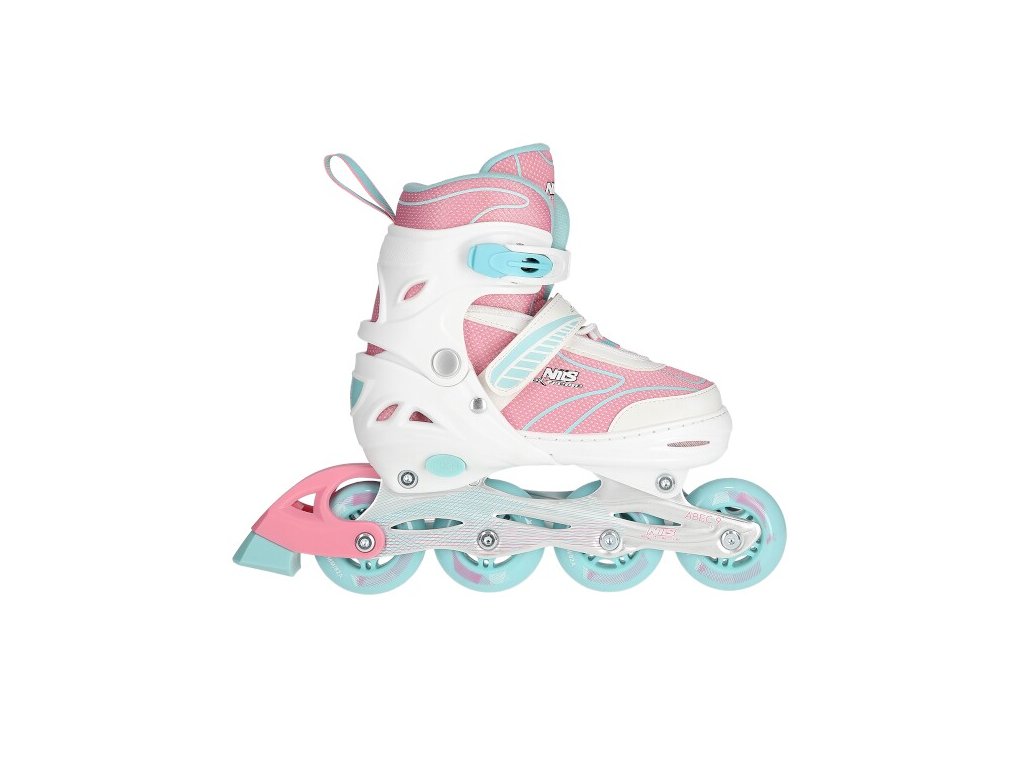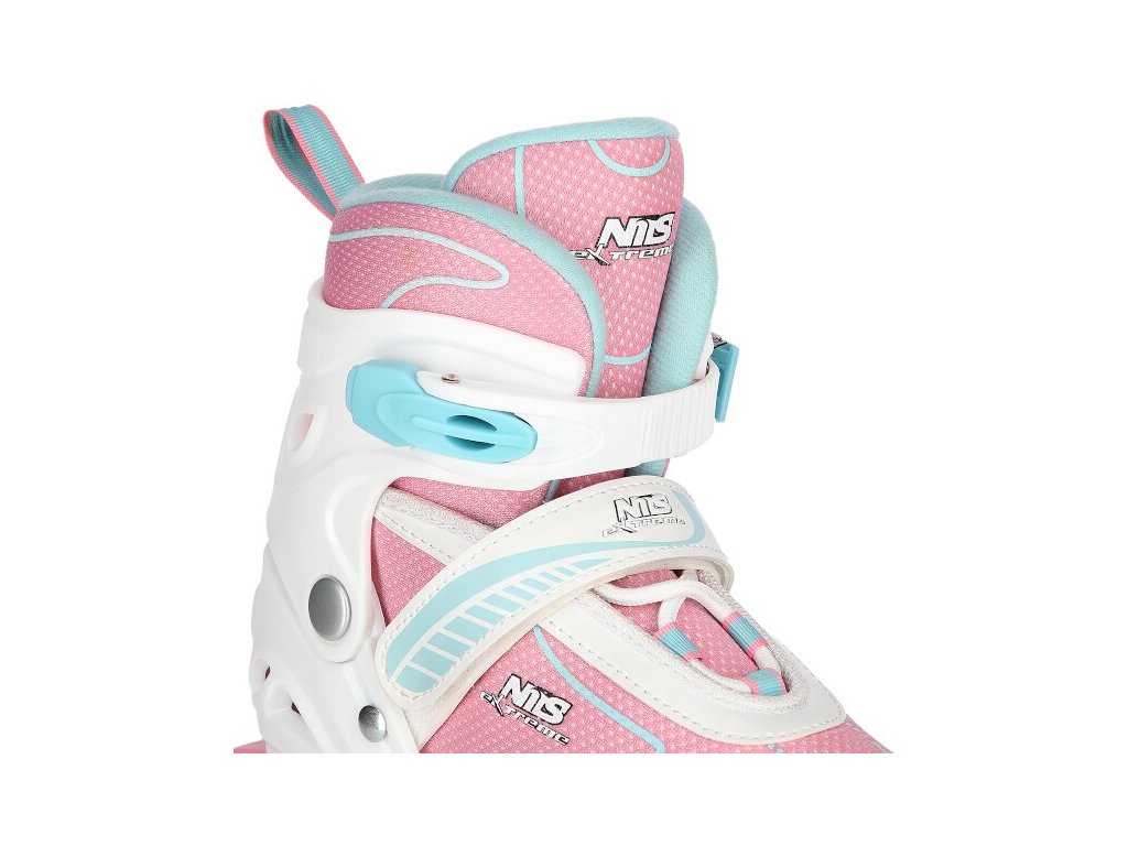 Korčule NILS Extreme NH11812 A sú ideálnym modelom pre začiatočníkov, alebo rekreačné korčuliarov. Súčasťou balenia sú dva podvozky, priamo na korčuli je in-line podvozok, ktorý je možné vymeniť za lištu s nožom na ľad. Z In-line korčúľ sa tak razom stanú korčule hokejové. Polomäkká topánka je vybavená tlačidlom pre rýchly výber jedného zo štyroch rozmerov. Pohodlná vložka je vyrobená zo sieťoviny, bavlny v úprave PEP a vnútorné, plyšové strany. Zapínanie je riešené klasickou trojkombináciou (dvojsekčná pracka, remienok so suchým zipsom a šnurovanie).